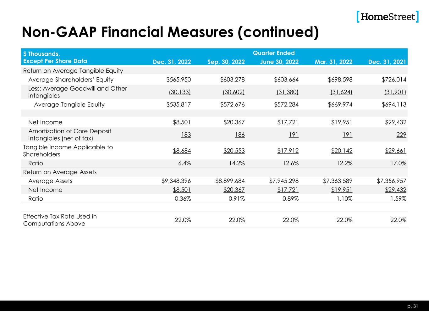 Non-GAAP Financial Measures $ Thousands, Except Per Share Data Quarter Ended Dec. 31, 2022 Sep. 30, 2022 June 30, 2022 Mar. 31, 2022 Dec. 31, 2021 Tangible Book Value per Share Shareholders’ Equity $562,147 $522,789 $580,767 $601,231 $715,339 Less: Goodwill and Other Intangibles (29,980) (30,215) (31,219) (31,464) (31,709) Tangible Shareholders’ Equity $532,167 $522,574 $549,548 $569,767 $683,630 Common Shares Outstanding 18,730,380 18,717,557 18,712,789 18,700,536 20,085,336 Computed Amount $28.41 $27.92 $29.37 $30.47 $34.04 Tangible Common Equity to Tangible Assets Tangible Shareholders’ Equity $532,167 $522,574 $549,548 $569,767 $683,630 Tangible Assets Total Assets $9,364,760 $9,072,887 $8,582,886 $7,510,894 $7,204,091 Less: Goodwill and other intangibles (29,980) (30,215) (31,219) (31,464) (31,709) Net $9,334,780 $9,042,672 $8,551,667 $7,479,430 $7,172,382 Ratio 5.7% 5.8% 6.4% 7.6% 9.5% p. 30