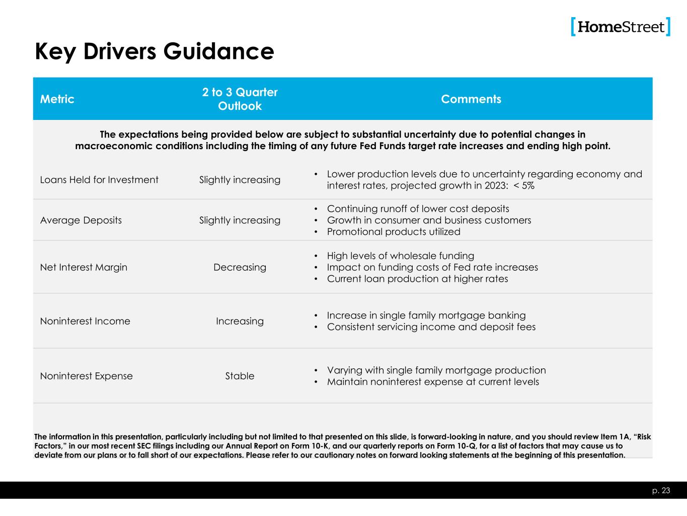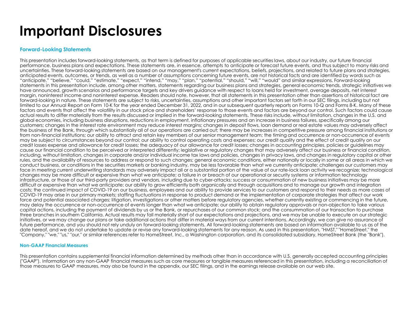 Important Disclosures Forward-Looking Statements This presentation includes forward-looking statements, as that term is defined for purposes of applicable securities laws, about our industry, our future financial performance, business plans and expectations. These statements are, in essence, attempts to anticipate or forecast future events, and thus subject to many risks and uncertainties. These forward-looking statements are based on our management's current expectations, beliefs, projections, and related to future plans and strategies, anticipated events, outcomes, or trends, as well as a number of assumptions concerning future events, are not historical facts and are identified by words such as “anticipate,” “believe,” “could,” “estimate,” “expect,” “intend,” “may,” “plan,” “potential,” “should,” “will,” “would” and similar expressions. Forward-looking statements in this presentation include, among other matters, statements regarding our business plans and strategies, general economic trends, strategic initiatives we have announced, growth scenarios and performance targets and key drivers guidance with respect to loans held for investment, average deposits, net interest margin, noninterest income and noninterest expense. Readers should note, however, that all statements in this presentation other than assertions of historical fact are forward-looking in nature. These statements are subject to risks, uncertainties, assumptions and other important factors set forth in our SEC filings, including but not limited to our Annual Report on Form 10-K for the year ended December 31, 2022, and in our subsequent quarterly reports on Forms 10-Q and Forms 8-K. Many of these factors and events that affect the volatility in our stock price and shareholders’ response to those events and factors are beyond our control. Such factors could cause actual results to differ materially from the results discussed or implied in the forward-looking statements. These risks include, without limitation, changes in the U.S. and global economies, including business disruptions, reductions in employment, inflationary pressures and an increase in business failures, specifically among our customers; changes in the interest rate environment may reduce interest margins; changes in deposit flows, loan demand or real estate values may adversely affect the business of the Bank, through which substantially all of our operations are carried out; there may be increases in competitive pressure among financial institutions or from non-financial institutions; our ability to attract and retain key members of our senior management team; the timing and occurrence or non-occurrence of events may be subject to circumstances beyond our control; our ability to control operating costs and expenses; our credit quality and the effect of credit quality on our credit losses expense and allowance for credit losses; the adequacy of our allowance for credit losses; changes in accounting principles, policies or guidelines may cause our financial condition to be perceived or interpreted differently; legislative or regulatory changes that may adversely affect our business or financial condition, including, without limitation, changes in corporate and/or individual income tax laws and policies, changes in privacy laws, and changes in regulatory capital or other rules, and the availability of resources to address or respond to such changes; general economic conditions, either nationally or locally in some or all areas in which we conduct business, or conditions in the securities markets or banking industry, may be less favorable than what we currently anticipate; challenges our customers may face in meeting current underwriting standards may adversely impact all or a substantial portion of the value of our rate-lock loan activity we recognize; technological changes may be more difficult or expensive than what we anticipate; a failure in or breach of our operational or security systems or information technology infrastructure, or those of our third-party providers and vendors, including due to cyber-attacks; success or consummation of new business initiatives may be more difficult or expensive than what we anticipate; our ability to grow efficiently both organically and through acquisitions and to manage our growth and integration costs; the continued impact of COVID-19 on our business, employees and our ability to provide services to our customers and respond to their needs as more cases of COVID-19 may arise in our primary markets; staffing fluctuations in response to product demand or the implementation of corporate strategies that affect our work force and potential associated charges; litigation, investigations or other matters before regulatory agencies, whether currently existing or commencing in the future, may delay the occurrence or non-occurrence of events longer than what we anticipate; our ability to obtain regulatory approvals or non-objection to take various capital actions, including the payment of dividends by us or the Bank, or repurchases of our common stock; and the consummation of our transaction to purchase three branches in southern California. Actual results may fall materially short of our expectations and projections, and we may be unable to execute on our strategic initiatives, or we may change our plans or take additional actions that differ in material ways from our current intentions. Accordingly, we can give no assurance of future performance, and you should not rely unduly on forward-looking statements. All forward-looking statements are based on information available to us as of the date hereof, and we do not undertake to update or revise any forward-looking statements for any reason. As used in this presentation, "HMST," "HomeStreet," the "Company," "we," "us," "our," or similar references refer to HomeStreet, Inc., a Washington corporation, and its consolidated subsid