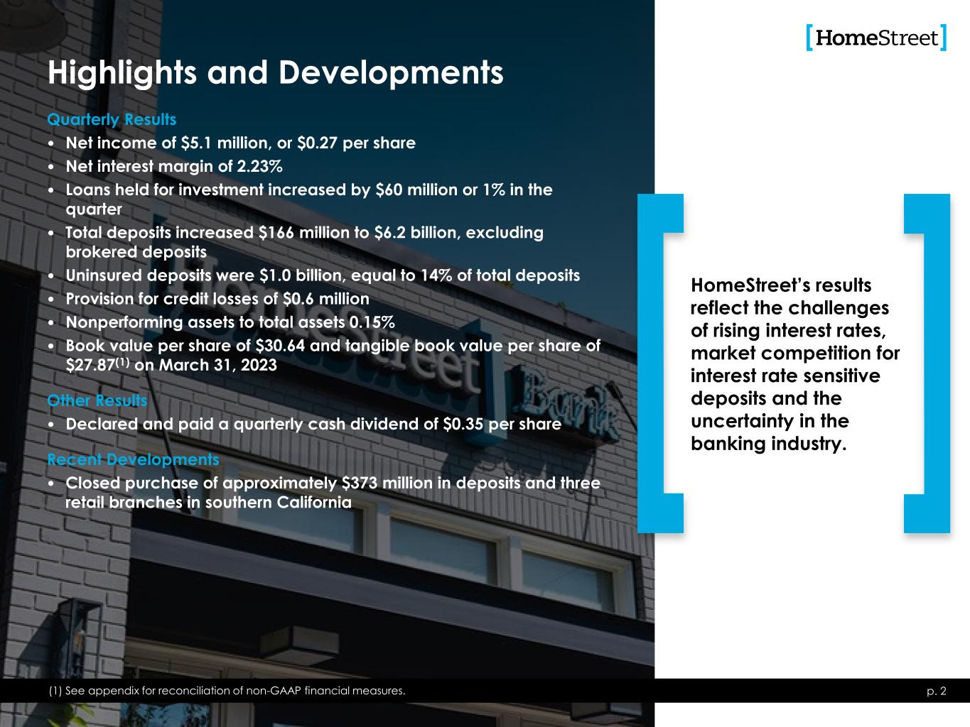 Highlights and Developments p. 2 Quarterly Results • Net income of $5.1 million, or $0.27 per share • Net interest margin of 2.23% • Loans held for investment increased by $60 million or 1% in the quarter • Total deposits increased $166 million to $6.2 billion, excluding brokered deposits • Uninsured deposits were $1.0 billion, equal to 14% of total deposits • Provision for credit losses of $0.6 million • Nonperforming assets to total assets 0.15% • Book value per share of $30.64 and tangible book value per share of $27.87(1) on March 31, 2023 Other Results • Declared and paid a quarterly cash dividend of $0.35 per share Recent Developments • Closed purchase of approximately $373 million in deposits and three retail branches in southern California HomeStreet’s results reflect the challenges of rising interest rates, market competition for interest rate sensitive deposits and the uncertainty in the banking industry. (1) See appendix for reconciliation of non-GAAP financial measures.