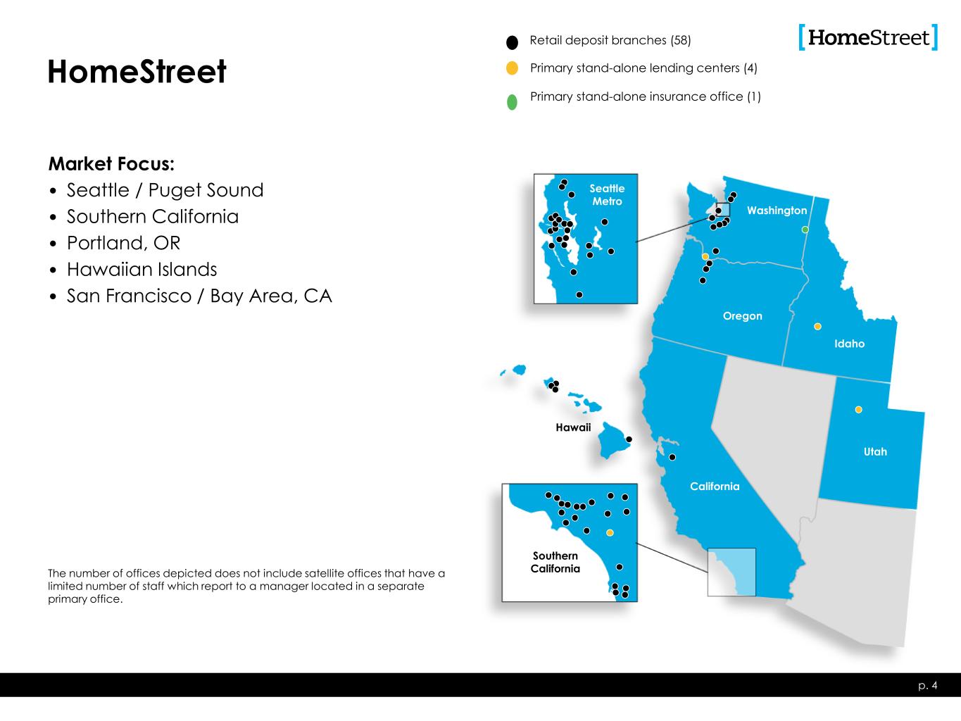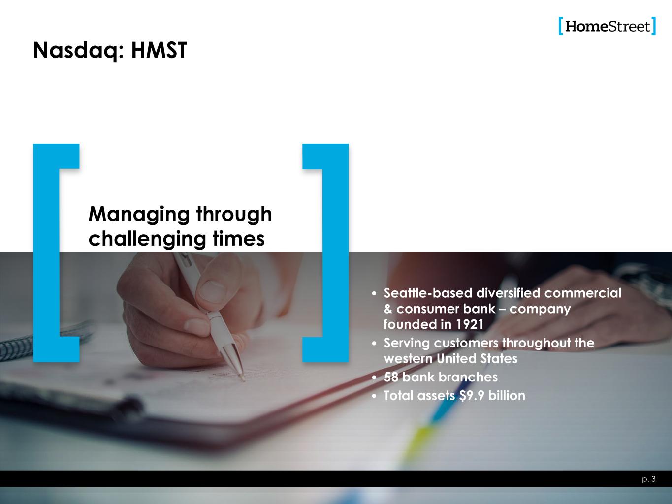 p. 3 Managing through challenging times • Seattle-based diversified commercial & consumer bank – company founded in 1921 • Serving customers throughout the western United States • 58 bank branches • Total assets $9.9 billion Nasdaq: HMST