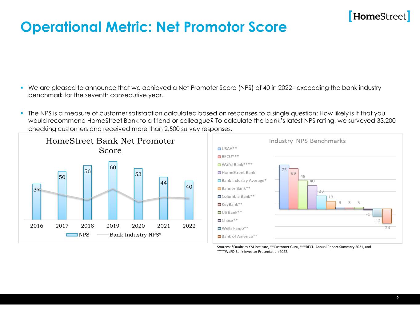 The content Operational Metric: Net Promotor Score  We are pleased to announce that we achieved a Net Promoter Score (NPS) of 40 in 2022– exceeding the bank industry benchmark for the seventh consecutive year.  The NPS is a measure of customer satisfaction calculated based on responses to a single question: How likely is it that you would recommend HomeStreet Bank to a friend or colleague? To calculate the bank’s latest NPS rating, we surveyed 33,200 checking customers and received more than 2,500 survey responses. 6 37 50 56 60 53 44 40 2016 2017 2018 2019 2020 2021 2022 HomeStreet Bank Net Promoter Score NPS Bank Industry NPS* Sources: *Qualtrics XM institute, **Customer Guru, ***BECU Annual Report Summary 2021, and ****WaFD Bank Investor Presentation 2022.