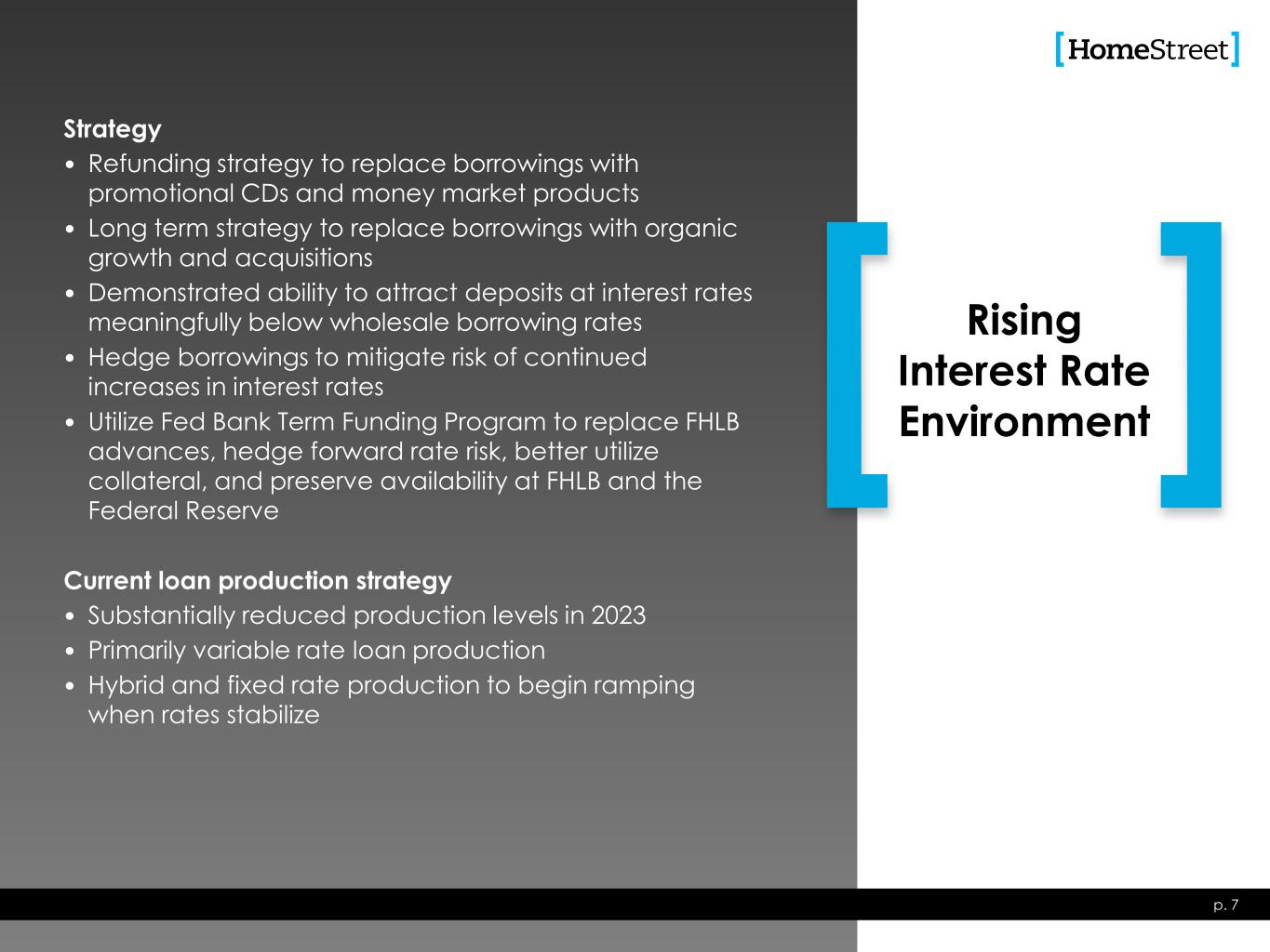p. 7 Strategy • Refunding strategy to replace borrowings with promotional CDs and money market products • Long term strategy to replace borrowings with organic growth and acquisitions • Demonstrated ability to attract deposits at interest rates meaningfully below wholesale borrowing rates • Hedge borrowings to mitigate risk of continued increases in interest rates • Utilize Fed Bank Term Funding Program to replace FHLB advances, hedge forward rate risk, better utilize collateral, and preserve availability at FHLB and the Federal Reserve Current loan production strategy • Substantially reduced production levels in 2023 • Primarily variable rate loan production • Hybrid and fixed rate production to begin ramping when rates stabilize Rising Interest Rate Environment