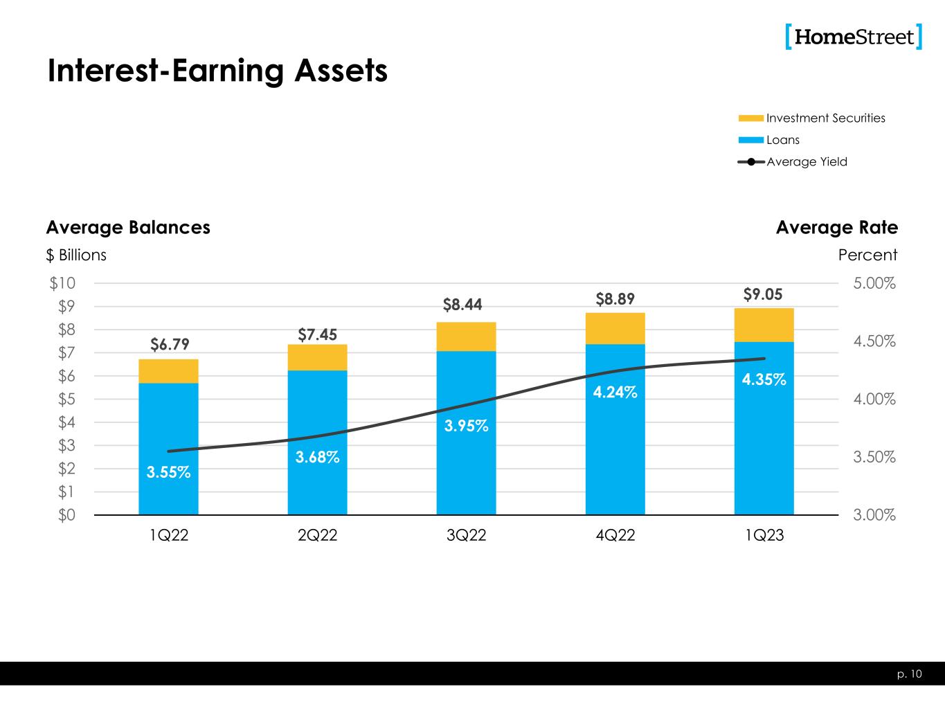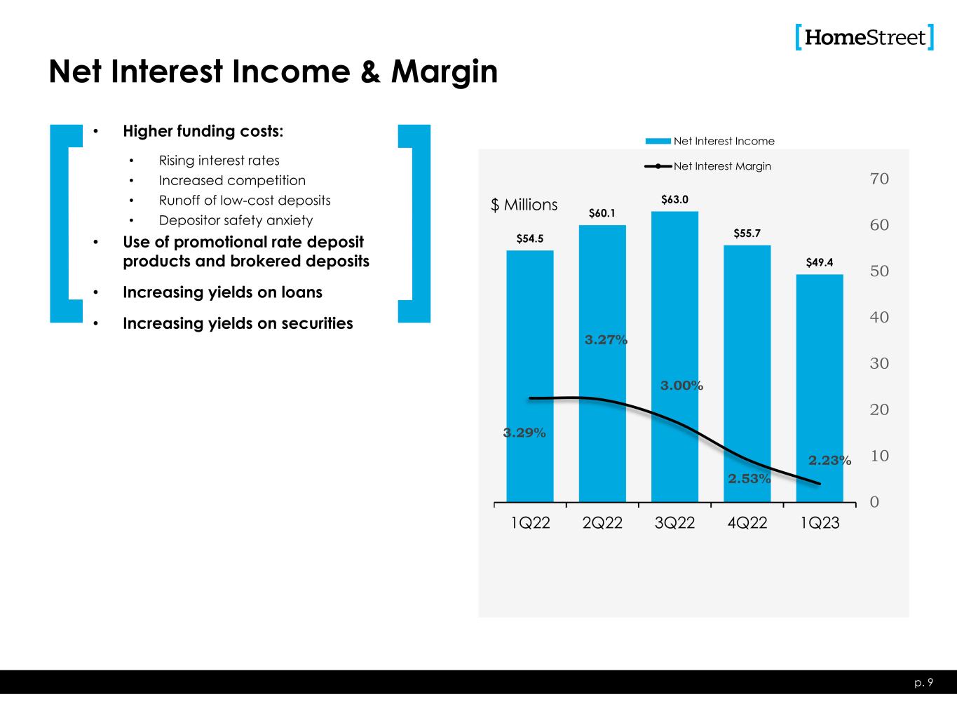 $54.5 $60.1 $63.0 $55.7 $49.4 3.29% 3.27% 3.00% 2.53% 2.23% 0 10 20 30 40 50 60 70 1Q22 2Q22 3Q22 4Q22 1Q23 Net Interest Income Net Interest Margin Net Interest Income & Margin p. 9 $ Millions • Higher funding costs: • Rising interest rates • Increased competition • Runoff of low-cost deposits • Depositor safety anxiety • Use of promotional rate deposit products and brokered deposits • Increasing yields on loans • Increasing yields on securities