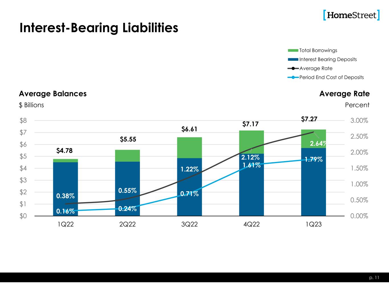 $6.79 $7.45 $8.44 $8.89 $9.05 3.55% 3.68% 3.95% 4.24% 4.35% 3.00% 3.50% 4.00% 4.50% 5.00% $0 $1 $2 $3 $4 $5 $6 $7 $8 $9 $10 1Q22 2Q22 3Q22 4Q22 1Q23 Investment Securities Loans Average Yield Interest-Earning Assets p. 10 Average Balances $ Billions Average Rate Percent