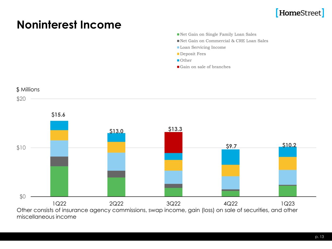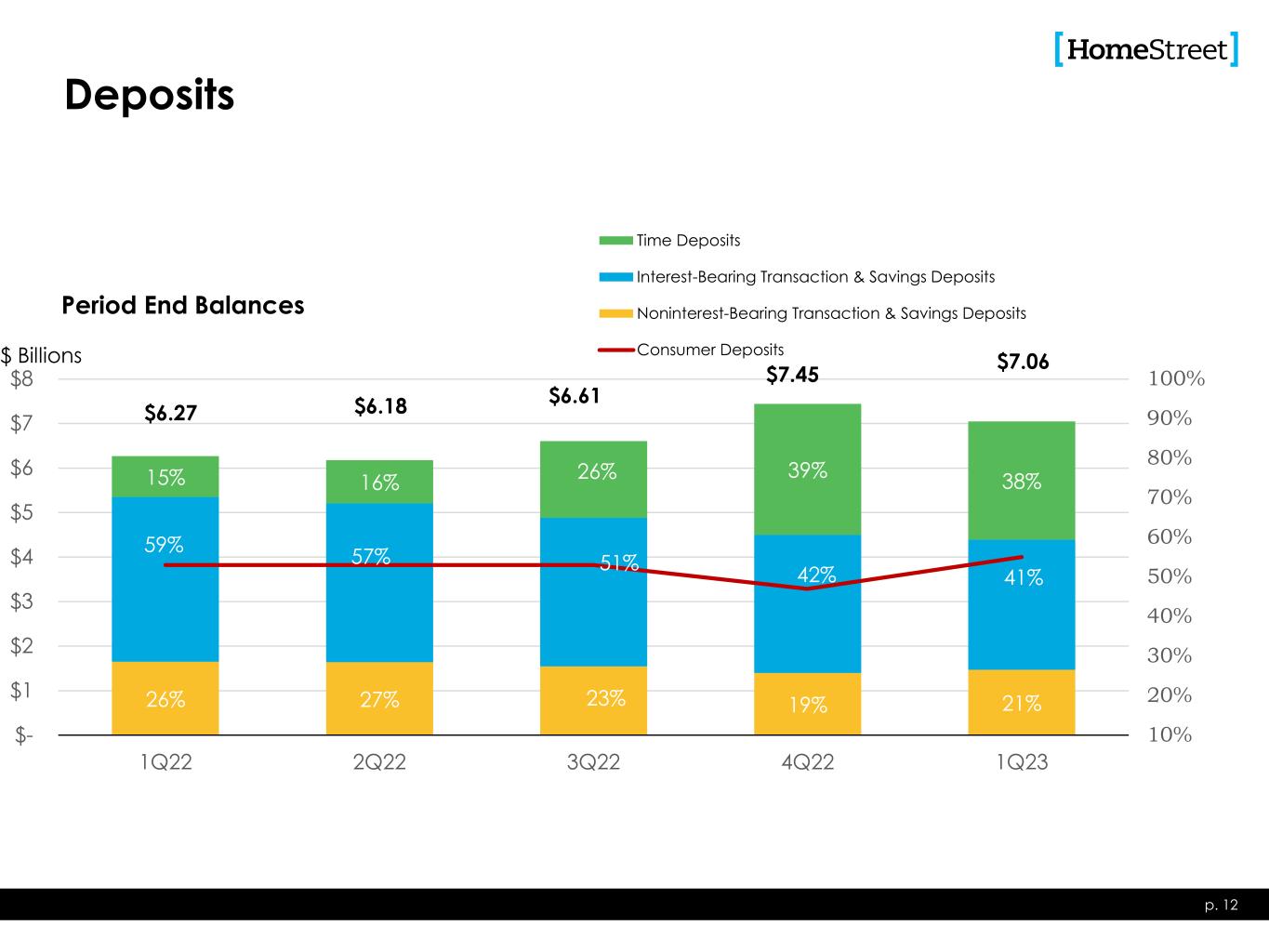 26% 27% 23% 19% 21% 59% 57% 51% 42% 41% 15% 16% 26% 39% 38% 10% 20% 30% 40% 50% 60% 70% 80% 90% 100% $- $1 $2 $3 $4 $5 $6 $7 $8 1Q22 2Q22 3Q22 4Q22 1Q23 Time Deposits Interest-Bearing Transaction & Savings Deposits Noninterest-Bearing Transaction & Savings Deposits Consumer Deposits Deposits p. 12 $6.27 $6.18 $6.61 $7.45 $7.06 Period End Balances $ Billions