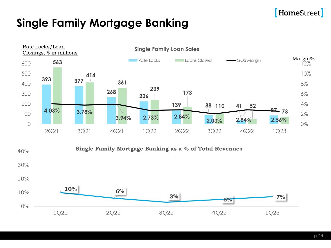 $15.6 $13.0 $13.3 $9.7 $10.2 $0 $10 $20 1Q22 2Q22 3Q22 4Q22 1Q23 Net Gain on Single Family Loan Sales Net Gain on Commercial & CRE Loan Sales Loan Servicing Income Deposit Fees Other Gain on sale of branches Noninterest Income p. 13 $ Millions Other consists of insurance agency commissions, swap income, gain (loss) on sale of securities, and other miscellaneous income