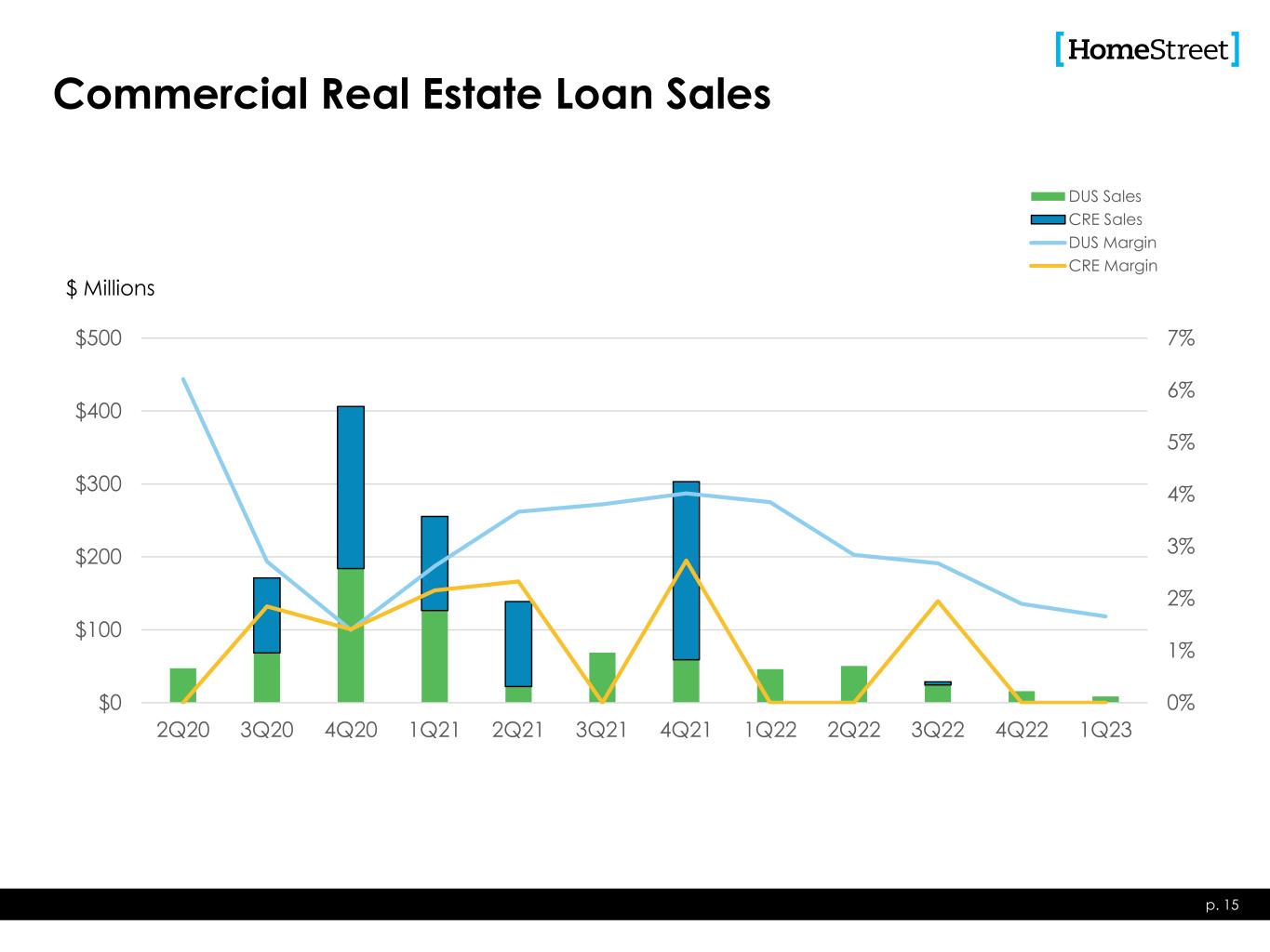 393 377 268 226 139 88 41 87 563 414 361 239 173 110 52 734.03% 3.78% 3.94% 2.73% 2.84% 2.03% 2.84% 2.56% 0% 2% 4% 6% 8% 10% 12% 0 100 200 300 400 500 600 2Q21 3Q21 4Q21 1Q22 2Q22 3Q22 4Q22 1Q23 Single Family Loan Sales Rate Locks Loans Closed GOS Margin Rate Locks/Loan Closings, $ in millions Margin% Single Family Mortgage Banking p. 14 10% 6% 3% 5% 7% 0% 10% 20% 30% 40% 1Q22 2Q22 3Q22 4Q22 1Q23 Single Family Mortgage Banking as a % of Total Revenues