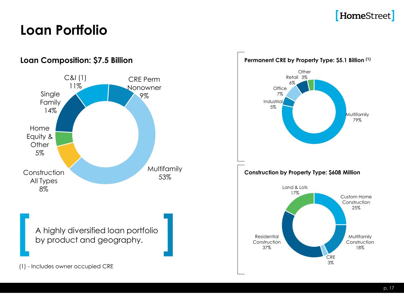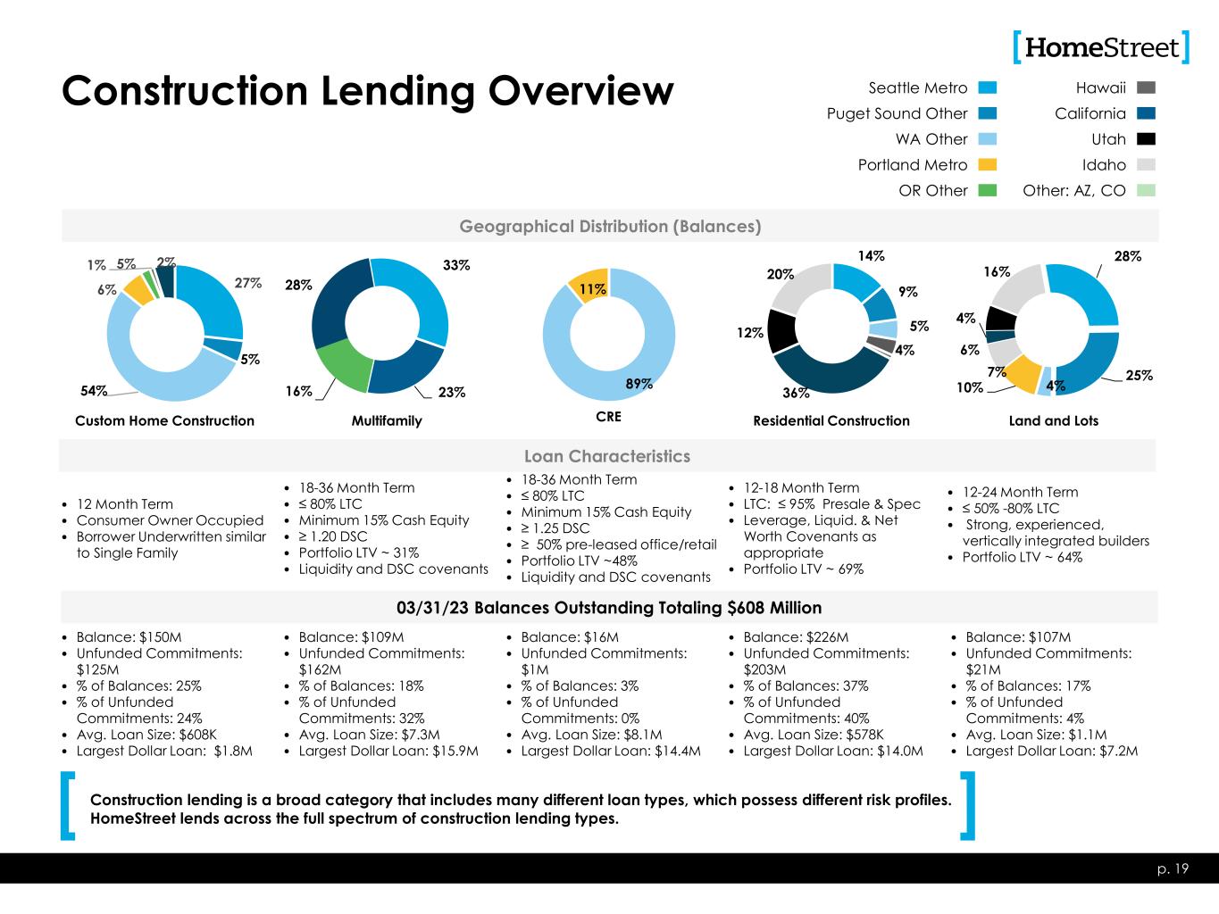 Permanent Commercial Real Estate Lending Overview • Up To 30 Year Term • $30MM Loan Amt. Max • ≥ 1.15 DSCR • Avg. LTV @ Orig. ~ 60% p. 18 Loan Characteristics • Up To 15 Year Term • $30MM Loan Amt. Max • ≥ 1.25 DSCR • Avg. LTV @ Orig. ~ 62% • Up To 15 Year Term • $30MM Loan Amt. Max • ≥ 1.25 DSCR • Avg. LTV @ Orig. ~ 66% • Up To 15 Year Term • $30MM Loan Amt. Max • ≥ 1.25 DSCR • Avg. LTV @ Orig. ~ 54% • Additional property types are reviewed on a case by case basis • Includes acquired loan types • Examples include: hotels, schools, churches, marinas • Balance: $4.0B • % of Balances: 79% • Portfolio Avg. LTV ~ 57%(1) • Portfolio Avg. DSCR ~ 1.36x • Avg. Loan Size: $5.3M • Largest Dollar Loan: $48.0M 03/31/23 Balances Outstanding Totaling $5.1 Billion • Balance: $229M • % of Balances: 5% • % Owner Occupied: 51% • Portfolio LTV ~ 51%(1) • Portfolio Avg. DSCR ~ 1.62x • Avg. Loan Size: $2.4M • Largest Dollar Loan: $21.3M • Balance: $376M • % of Balances: 7% • % Owner Occupied: 30% • Portfolio LTV ~ 57%(1) • Portfolio Avg. DSCR ~ 1.70x • Avg. Loan Size: $2.4M • Largest Dollar Loan: $23.4M • Balance: $316M • % of Balances: 6% • % Owner Occupied: 20% • Portfolio LTV ~ 47%(1) • Portfolio Avg. DSCR ~ 1.66x • Avg. Loan Size: $2.8M • Largest Dollar Loan: $15.5M • Balance: $171M • % of Balances: 3% • % of Owner Occupied: 84% • Portfolio LTV ~ 36%(1) • Portfolio Avg. DSCR ~ 2.02x • Avg. Loan Size: $3.8M • Largest Dollar Loan: $23.8M 46% 22% 8% 15% 6% 3% Geographical Distribution (Balances) Multifamily 15% 27% 1%3% 46% 8% Industrial / Warehouse 15% 14% 4% 6% 48% 13% Office 18% 25%9% 7% 39% 2% Retail 5% 5% 1% 77% 12% Other CA Los Angeles County CA Other Oregon Other WA King/Pierce/Snohomish WA Other (1) Property values as of origination date. • HomeStreet lends across the full spectrum of commercial real estate lending types, but is deliberate in its effort to achieve diversification among property types and geographic areas to mitigate concentration risk. • “Other” category includes loans secured by Schools ($81.7 million), Hotels ($28.8 million), and Churches ($13.3 million).
