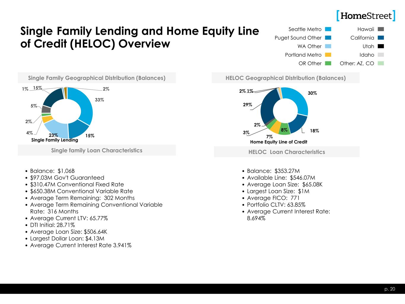 Construction Lending Overview • 12 Month Term • Consumer Owner Occupied • Borrower Underwritten similar to Single Family p. 19 Loan Characteristics • 18-36 Month Term • ≤ 80% LTC • Minimum 15% Cash Equity • ≥ 1.20 DSC • Portfolio LTV ~ 31% • Liquidity and DSC covenants • 18-36 Month Term • ≤ 80% LTC • Minimum 15% Cash Equity • ≥ 1.25 DSC • ≥ 50% pre-leased office/retail • Portfolio LTV ~48% • Liquidity and DSC covenants • 12-18 Month Term • LTC: ≤ 95% Presale & Spec • Leverage, Liquid. & Net Worth Covenants as appropriate • Portfolio LTV ~ 69% • 12-24 Month Term • ≤ 50% -80% LTC • Strong, experienced, vertically integrated builders • Portfolio LTV ~ 64% • Balance: $150M • Unfunded Commitments: $125M • % of Balances: 25% • % of Unfunded Commitments: 24% • Avg. Loan Size: $608K • Largest Dollar Loan: $1.8M 03/31/23 Balances Outstanding Totaling $608 Million • Balance: $109M • Unfunded Commitments: $162M • % of Balances: 18% • % of Unfunded Commitments: 32% • Avg. Loan Size: $7.3M • Largest Dollar Loan: $15.9M • Balance: $16M • Unfunded Commitments: $1M • % of Balances: 3% • % of Unfunded Commitments: 0% • Avg. Loan Size: $8.1M • Largest Dollar Loan: $14.4M • Balance: $226M • Unfunded Commitments: $203M • % of Balances: 37% • % of Unfunded Commitments: 40% • Avg. Loan Size: $578K • Largest Dollar Loan: $14.0M • Balance: $107M • Unfunded Commitments: $21M • % of Balances: 17% • % of Unfunded Commitments: 4% • Avg. Loan Size: $1.1M • Largest Dollar Loan: $7.2M 27% 5% 54% 6% 2%1% 5% Geographical Distribution (Balances) Custom Home Construction 33% 23%16% 28% Multifamily 89% 11% CRE 14% 9% 5% 4% 36% 12% 20% Residential Construction 28% 25% 4%10% 7% 4% 6% 16% Land and Lots Seattle Metro Puget Sound Other WA Other Portland Metro OR Other Hawaii California Utah Idaho Other: AZ, CO Construction lending is a broad category that includes many different loan types, which possess different risk profiles. HomeStreet lends across the full spectrum of construction lending types.