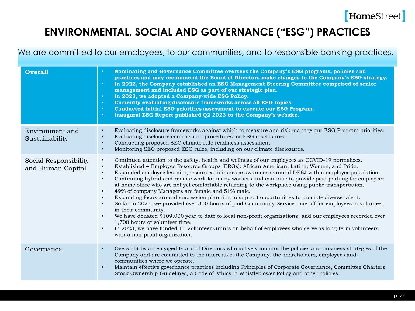 We are committed to our employees, to our communities, and to responsible banking practices. ENVIRONMENTAL, SOCIAL AND GOVERNANCE (“ESG”) PRACTICES p. 24 Overall • Nominating and Governance Committee oversees the Company’s ESG programs, policies and practices and may recommend the Board of Directors make changes to the Company’s ESG strategy. • In 2022, the Company established an ESG Management Steering Committee comprised of senior management and included ESG as part of our strategic plan. • In 2023, we adopted a Company-wide ESG Policy. • Currently evaluating disclosure frameworks across all ESG topics. • Conducted initial ESG priorities assessment to execute our ESG Program. • Inaugural ESG Report published Q2 2023 to the Company’s website. Environment and Sustainability • Evaluating disclosure frameworks against which to measure and risk manage our ESG Program priorities. • Evaluating disclosure controls and procedures for ESG disclosures. • Conducting proposed SEC climate rule readiness assessment. • Monitoring SEC proposed ESG rules, including on our climate disclosures. Social Responsibility and Human Capital • Continued attention to the safety, health and wellness of our employees as COVID-19 normalizes. • Established 4 Employee Resource Groups (ERGs): African American, Latinx, Women, and Pride. • Expanded employee learning resources to increase awareness around DE&I within employee population. • Continuing hybrid and remote work for many workers and continue to provide paid parking for employees at home office who are not yet comfortable returning to the workplace using public transportation. • 49% of company Managers are female and 51% male. • Expanding focus around succession planning to support opportunities to promote diverse talent. • So far in 2023, we provided over 300 hours of paid Community Service time-off for employees to volunteer in their community. • We have donated $109,000 year to date to local non-profit organizations, and our employees recorded over 1,700 hours of volunteer time. • In 2023, we have funded 11 Volunteer Grants on behalf of employees who serve as long-term volunteers with a non-profit organization. Governance • Oversight by an engaged Board of Directors who actively monitor the policies and business strategies of the Company and are committed to the interests of the Company, the shareholders, employees and communities where we operate. • Maintain effective governance practices including Principles of Corporate Governance, Committee Charters, Stock Ownership Guidelines, a Code of Ethics, a Whistleblower Policy and other policies.
