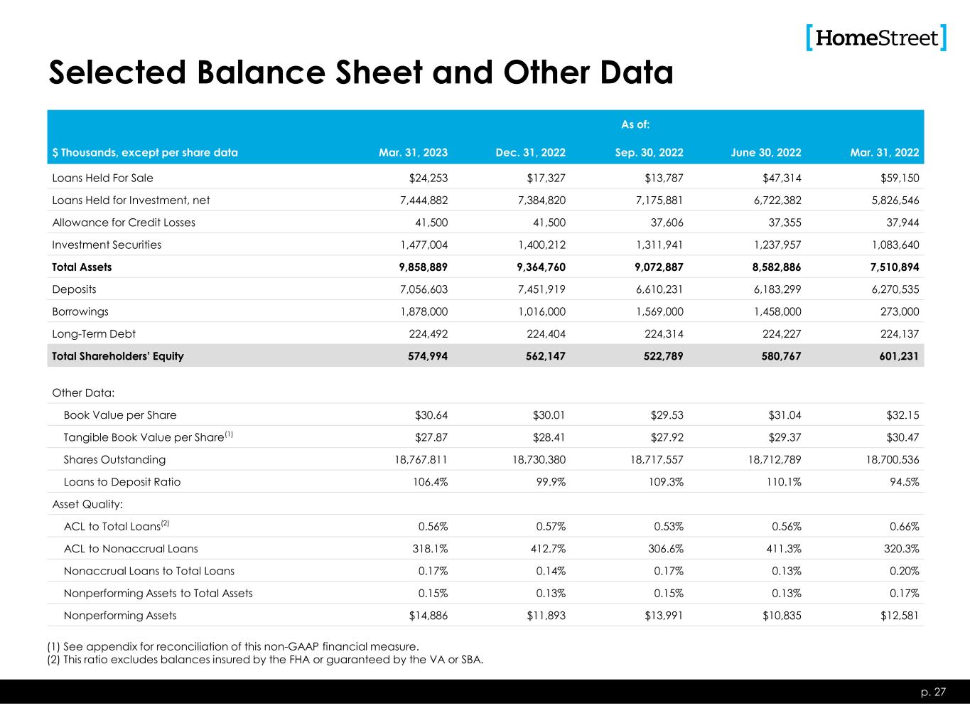 Selected Balance Sheet and Other Data As of: $ Thousands, except per share data Mar. 31, 2023 Dec. 31, 2022 Sep. 30, 2022 June 30, 2022 Mar. 31, 2022 Loans Held For Sale $24,253 $17,327 $13,787 $47,314 $59,150 Loans Held for Investment, net 7,444,882 7,384,820 7,175,881 6,722,382 5,826,546 Allowance for Credit Losses 41,500 41,500 37,606 37,355 37,944 Investment Securities 1,477,004 1,400,212 1,311,941 1,237,957 1,083,640 Total Assets 9,858,889 9,364,760 9,072,887 8,582,886 7,510,894 Deposits 7,056,603 7,451,919 6,610,231 6,183,299 6,270,535 Borrowings 1,878,000 1,016,000 1,569,000 1,458,000 273,000 Long-Term Debt 224,492 224,404 224,314 224,227 224,137 Total Shareholders’ Equity 574,994 562,147 522,789 580,767 601,231 Other Data: Book Value per Share $30.64 $30.01 $29.53 $31.04 $32.15 Tangible Book Value per Share(1) $27.87 $28.41 $27.92 $29.37 $30.47 Shares Outstanding 18,767,811 18,730,380 18,717,557 18,712,789 18,700,536 Loans to Deposit Ratio 106.4% 99.9% 109.3% 110.1% 94.5% Asset Quality: ACL to Total Loans(2) 0.56% 0.57% 0.53% 0.56% 0.66% ACL to Nonaccrual Loans 318.1% 412.7% 306.6% 411.3% 320.3% Nonaccrual Loans to Total Loans 0.17% 0.14% 0.17% 0.13% 0.20% Nonperforming Assets to Total Assets 0.15% 0.13% 0.15% 0.13% 0.17% Nonperforming Assets $14,886 $11,893 $13,991 $10,835 $12,581 p. 27 (1) See appendix for reconciliation of this non-GAAP financial measure. (2) This ratio excludes balances insured by the FHA or guaranteed by the VA or SBA.