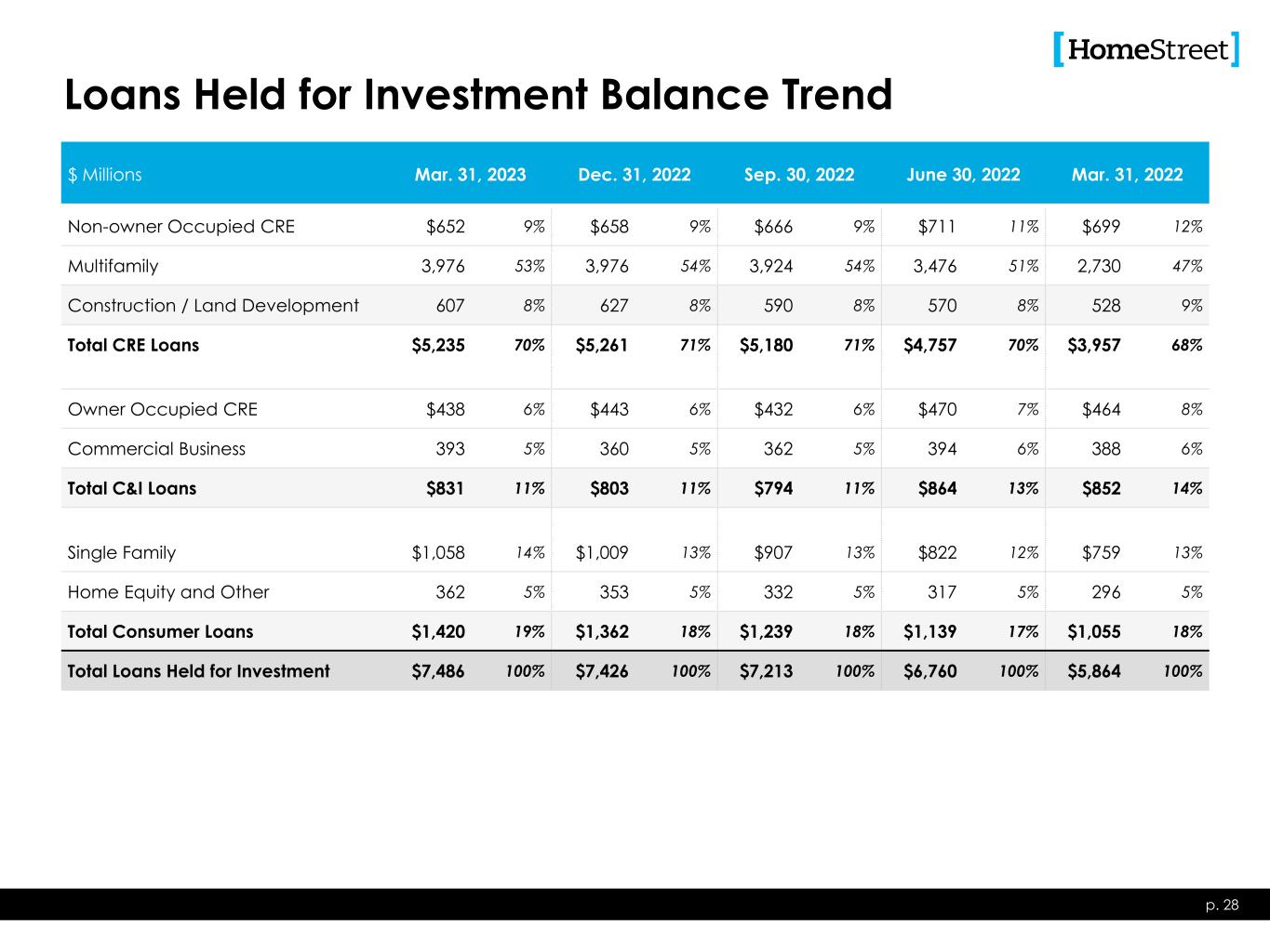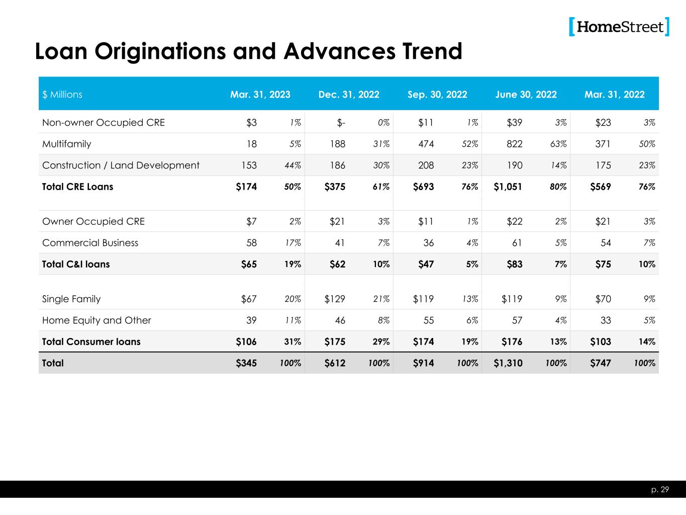 Loans Held for Investment Balance Trend p. 28 $ Millions Mar. 31, 2023 Dec. 31, 2022 Sep. 30, 2022 June 30, 2022 Mar. 31, 2022 Non-owner Occupied CRE $652 9% $658 9% $666 9% $711 11% $699 12% Multifamily 3,976 53% 3,976 54% 3,924 54% 3,476 51% 2,730 47% Construction / Land Development 607 8% 627 8% 590 8% 570 8% 528 9% Total CRE Loans $5,235 70% $5,261 71% $5,180 71% $4,757 70% $3,957 68% Owner Occupied CRE $438 6% $443 6% $432 6% $470 7% $464 8% Commercial Business 393 5% 360 5% 362 5% 394 6% 388 6% Total C&I Loans $831 11% $803 11% $794 11% $864 13% $852 14% Single Family $1,058 14% $1,009 13% $907 13% $822 12% $759 13% Home Equity and Other 362 5% 353 5% 332 5% 317 5% 296 5% Total Consumer Loans $1,420 19% $1,362 18% $1,239 18% $1,139 17% $1,055 18% Total Loans Held for Investment $7,486 100% $7,426 100% $7,213 100% $6,760 100% $5,864 100%