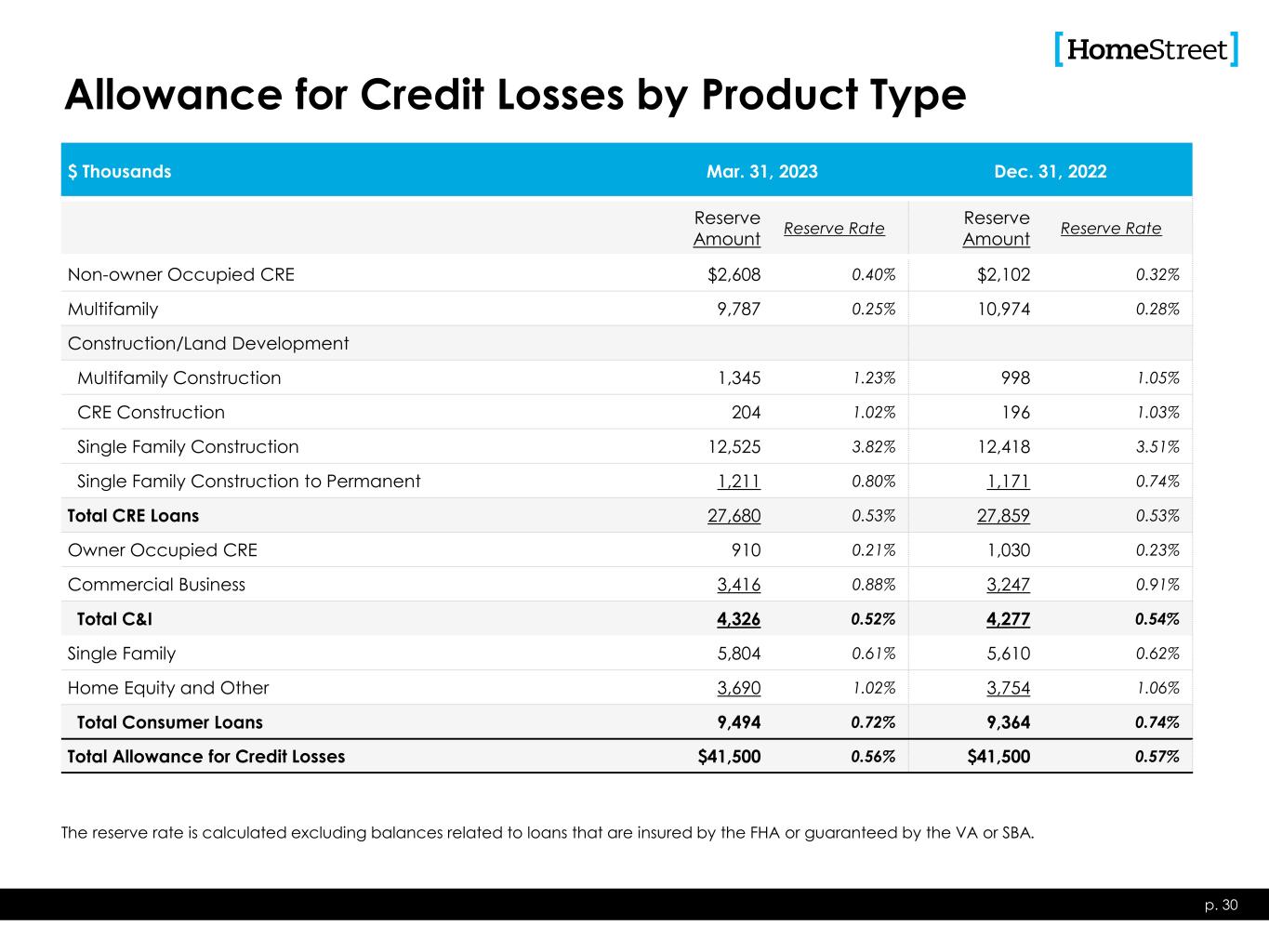 Allowance for Credit Losses by Product Type p. 30 $ Thousands Mar. 31, 2023 Dec. 31, 2022 Reserve Amount Reserve Rate Reserve Amount Reserve Rate Non-owner Occupied CRE $2,608 0.40% $2,102 0.32% Multifamily 9,787 0.25% 10,974 0.28% Construction/Land Development Multifamily Construction 1,345 1.23% 998 1.05% CRE Construction 204 1.02% 196 1.03% Single Family Construction 12,525 3.82% 12,418 3.51% Single Family Construction to Permanent 1,211 0.80% 1,171 0.74% Total CRE Loans 27,680 0.53% 27,859 0.53% Owner Occupied CRE 910 0.21% 1,030 0.23% Commercial Business 3,416 0.88% 3,247 0.91% Total C&I 4,326 0.52% 4,277 0.54% Single Family 5,804 0.61% 5,610 0.62% Home Equity and Other 3,690 1.02% 3,754 1.06% Total Consumer Loans 9,494 0.72% 9,364 0.74% Total Allowance for Credit Losses $41,500 0.56% $41,500 0.57% The reserve rate is calculated excluding balances related to loans that are insured by the FHA or guaranteed by the VA or SBA.