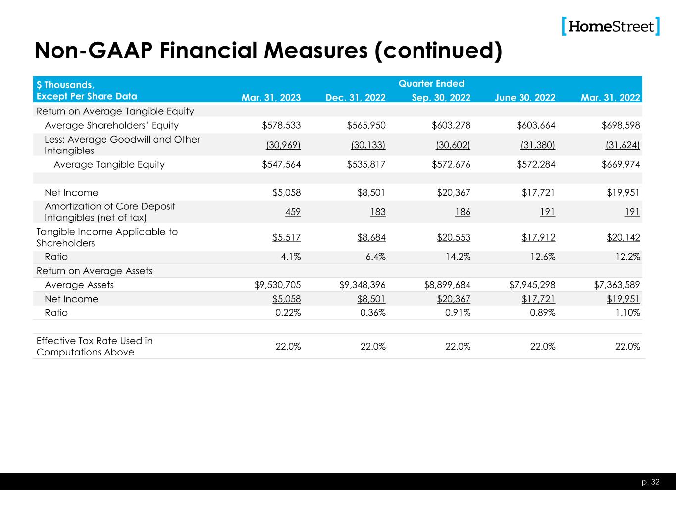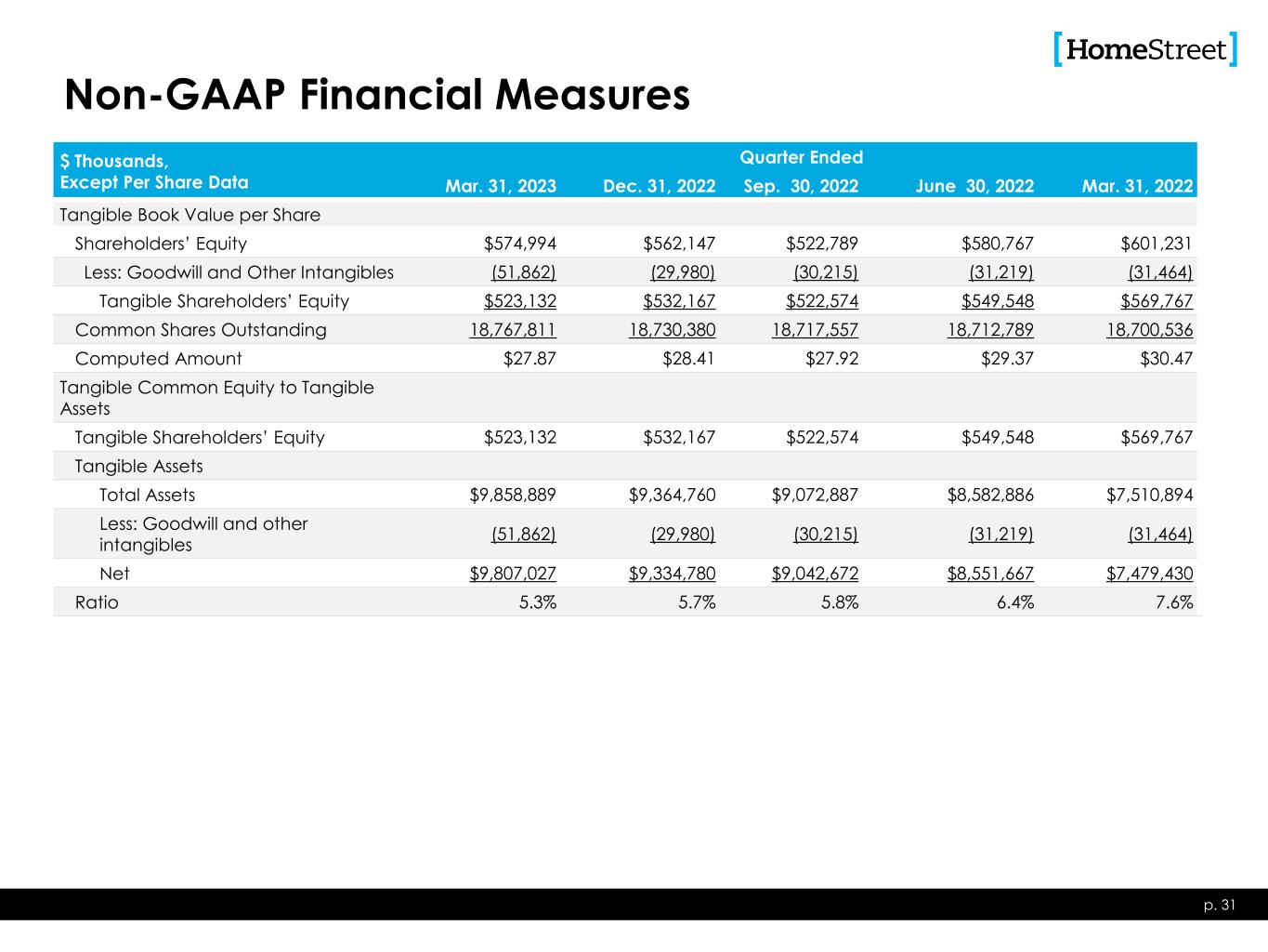 Non-GAAP Financial Measures $ Thousands, Except Per Share Data Quarter Ended Mar. 31, 2023 Dec. 31, 2022 Sep. 30, 2022 June 30, 2022 Mar. 31, 2022 Tangible Book Value per Share Shareholders’ Equity $574,994 $562,147 $522,789 $580,767 $601,231 Less: Goodwill and Other Intangibles (51,862) (29,980) (30,215) (31,219) (31,464) Tangible Shareholders’ Equity $523,132 $532,167 $522,574 $549,548 $569,767 Common Shares Outstanding 18,767,811 18,730,380 18,717,557 18,712,789 18,700,536 Computed Amount $27.87 $28.41 $27.92 $29.37 $30.47 Tangible Common Equity to Tangible Assets Tangible Shareholders’ Equity $523,132 $532,167 $522,574 $549,548 $569,767 Tangible Assets Total Assets $9,858,889 $9,364,760 $9,072,887 $8,582,886 $7,510,894 Less: Goodwill and other intangibles (51,862) (29,980) (30,215) (31,219) (31,464) Net $9,807,027 $9,334,780 $9,042,672 $8,551,667 $7,479,430 Ratio 5.3% 5.7% 5.8% 6.4% 7.6% p. 31