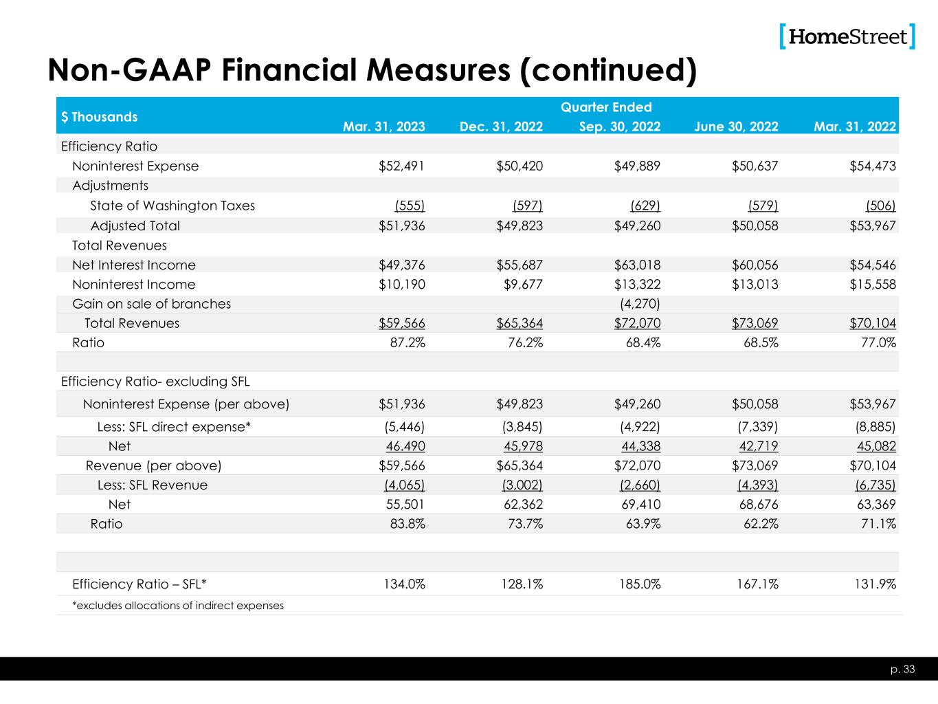 Non-GAAP Financial Measures (continued) $ Thousands, Except Per Share Data Quarter Ended Mar. 31, 2023 Dec. 31, 2022 Sep. 30, 2022 June 30, 2022 Mar. 31, 2022 Return on Average Tangible Equity Average Shareholders’ Equity $578,533 $565,950 $603,278 $603,664 $698,598 Less: Average Goodwill and Other Intangibles (30,969) (30,133) (30,602) (31,380) (31,624) Average Tangible Equity $547,564 $535,817 $572,676 $572,284 $669,974 Net Income $5,058 $8,501 $20,367 $17,721 $19,951 Amortization of Core Deposit Intangibles (net of tax) 459 183 186 191 191 Tangible Income Applicable to Shareholders $5,517 $8,684 $20,553 $17,912 $20,142 Ratio 4.1% 6.4% 14.2% 12.6% 12.2% Return on Average Assets Average Assets $9,530,705 $9,348,396 $8,899,684 $7,945,298 $7,363,589 Net Income $5,058 $8,501 $20,367 $17,721 $19,951 Ratio 0.22% 0.36% 0.91% 0.89% 1.10% Effective Tax Rate Used in Computations Above 22.0% 22.0% 22.0% 22.0% 22.0% p. 32