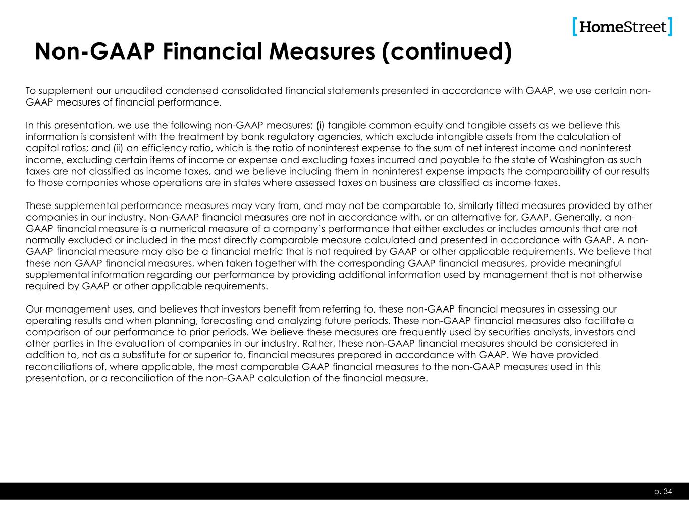 Non-GAAP Financial Measures (continued) p. 34 To supplement our unaudited condensed consolidated financial statements presented in accordance with GAAP, we use certain non- GAAP measures of financial performance. In this presentation, we use the following non-GAAP measures: (i) tangible common equity and tangible assets as we believe this information is consistent with the treatment by bank regulatory agencies, which exclude intangible assets from the calculation of capital ratios; and (ii) an efficiency ratio, which is the ratio of noninterest expense to the sum of net interest income and noninterest income, excluding certain items of income or expense and excluding taxes incurred and payable to the state of Washington as such taxes are not classified as income taxes, and we believe including them in noninterest expense impacts the comparability of our results to those companies whose operations are in states where assessed taxes on business are classified as income taxes. These supplemental performance measures may vary from, and may not be comparable to, similarly titled measures provided by other companies in our industry. Non-GAAP financial measures are not in accordance with, or an alternative for, GAAP. Generally, a non- GAAP financial measure is a numerical measure of a company’s performance that either excludes or includes amounts that are not normally excluded or included in the most directly comparable measure calculated and presented in accordance with GAAP. A non- GAAP financial measure may also be a financial metric that is not required by GAAP or other applicable requirements. We believe that these non-GAAP financial measures, when taken together with the corresponding GAAP financial measures, provide meaningful supplemental information regarding our performance by providing additional information used by management that is not otherwise required by GAAP or other applicable requirements. Our management uses, and believes that investors benefit from referring to, these non-GAAP financial measures in assessing our operating results and when planning, forecasting and analyzing future periods. These non-GAAP financial measures also facilitate a comparison of our performance to prior periods. We believe these measures are frequently used by securities analysts, investors and other parties in the evaluation of companies in our industry. Rather, these non-GAAP financial measures should be considered in addition to, not as a substitute for or superior to, financial measures prepared in accordance with GAAP. We have provided reconciliations of, where applicable, the most comparable GAAP financial measures to the non-GAAP measures used in this presentation, or a reconciliation of the non-GAAP calculation of the financial measure.