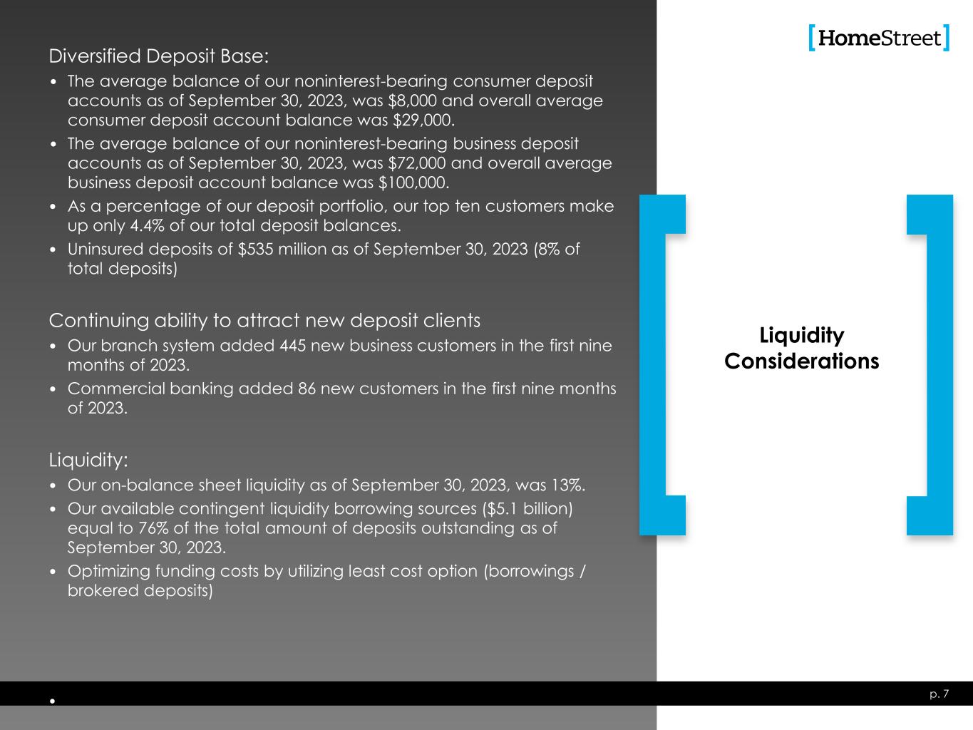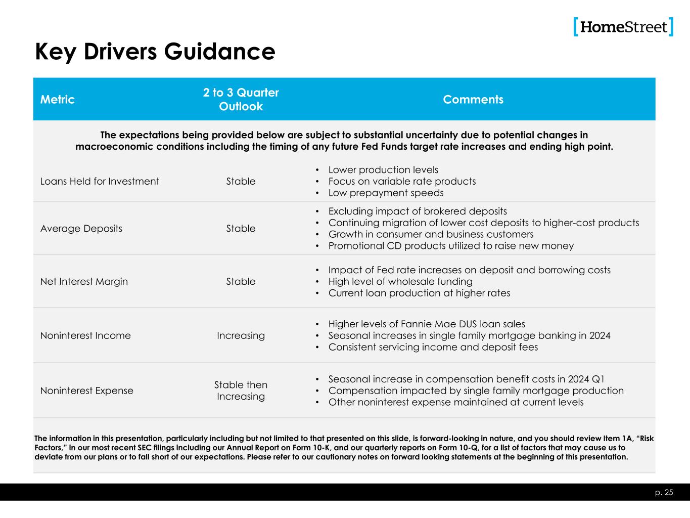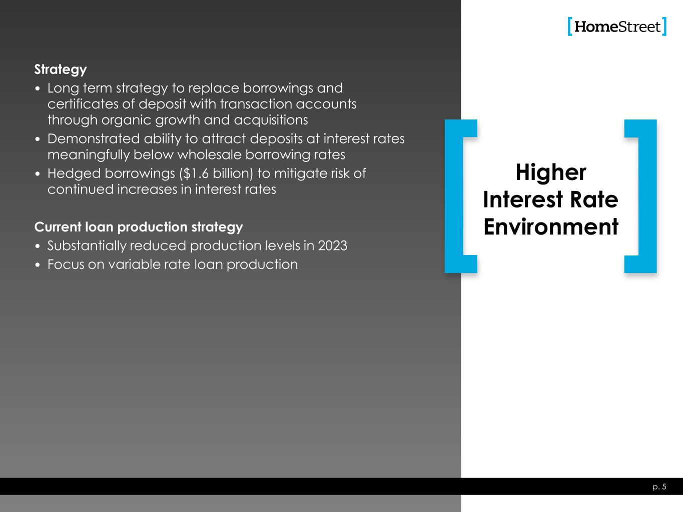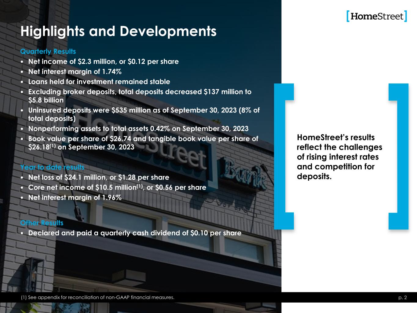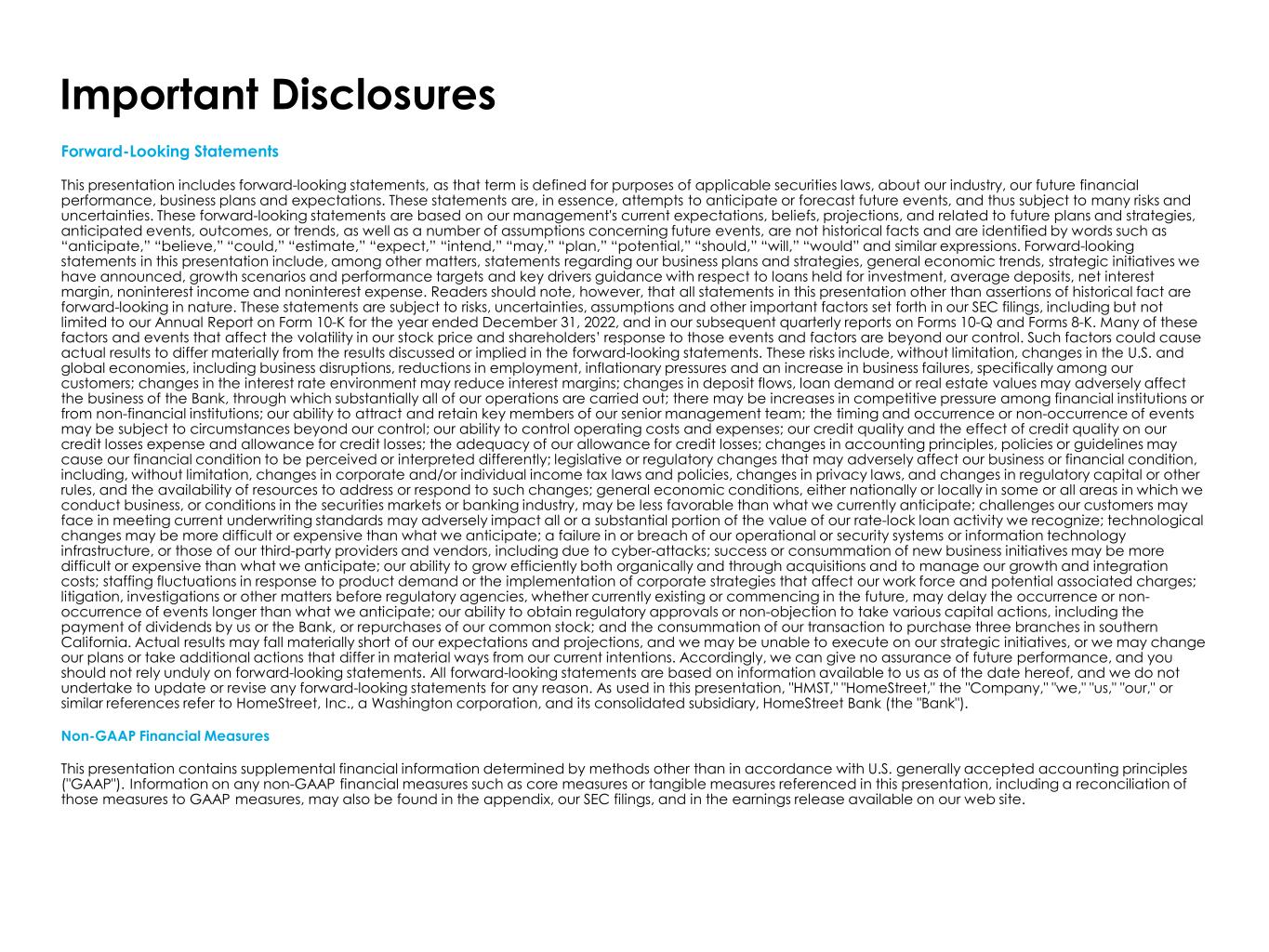 Important Disclosures Forward-Looking Statements This presentation includes forward-looking statements, as that term is defined for purposes of applicable securities laws, about our industry, our future financial performance, business plans and expectations. These statements are, in essence, attempts to anticipate or forecast future events, and thus subject to many risks and uncertainties. These forward-looking statements are based on our management's current expectations, beliefs, projections, and related to future plans and strategies, anticipated events, outcomes, or trends, as well as a number of assumptions concerning future events, are not historical facts and are identified by words such as “anticipate,” “believe,” “could,” “estimate,” “expect,” “intend,” “may,” “plan,” “potential,” “should,” “will,” “would” and similar expressions. Forward-looking statements in this presentation include, among other matters, statements regarding our business plans and strategies, general economic trends, strategic initiatives we have announced, growth scenarios and performance targets and key drivers guidance with respect to loans held for investment, average deposits, net interest margin, noninterest income and noninterest expense. Readers should note, however, that all statements in this presentation other than assertions of historical fact are forward-looking in nature. These statements are subject to risks, uncertainties, assumptions and other important factors set forth in our SEC filings, including but not limited to our Annual Report on Form 10-K for the year ended December 31, 2022, and in our subsequent quarterly reports on Forms 10-Q and Forms 8-K. Many of these factors and events that affect the volatility in our stock price and shareholders’ response to those events and factors are beyond our control. Such factors could cause actual results to differ materially from the results discussed or implied in the forward-looking statements. These risks include, without limitation, changes in the U.S. and global economies, including business disruptions, reductions in employment, inflationary pressures and an increase in business failures, specifically among our customers; changes in the interest rate environment may reduce interest margins; changes in deposit flows, loan demand or real estate values may adversely affect the business of the Bank, through which substantially all of our operations are carried out; there may be increases in competitive pressure among financial institutions or from non-financial institutions; our ability to attract and retain key members of our senior management team; the timing and occurrence or non-occurrence of events may be subject to circumstances beyond our control; our ability to control operating costs and expenses; our credit quality and the effect of credit quality on our credit losses expense and allowance for credit losses; the adequacy of our allowance for credit losses; changes in accounting principles, policies or guidelines may cause our financial condition to be perceived or interpreted differently; legislative or regulatory changes that may adversely affect our business or financial condition, including, without limitation, changes in corporate and/or individual income tax laws and policies, changes in privacy laws, and changes in regulatory capital or other rules, and the availability of resources to address or respond to such changes; general economic conditions, either nationally or locally in some or all areas in which we conduct business, or conditions in the securities markets or banking industry, may be less favorable than what we currently anticipate; challenges our customers may face in meeting current underwriting standards may adversely impact all or a substantial portion of the value of our rate-lock loan activity we recognize; technological changes may be more difficult or expensive than what we anticipate; a failure in or breach of our operational or security systems or information technology infrastructure, or those of our third-party providers and vendors, including due to cyber-attacks; success or consummation of new business initiatives may be more difficult or expensive than what we anticipate; our ability to grow efficiently both organically and through acquisitions and to manage our growth and integration costs; staffing fluctuations in response to product demand or the implementation of corporate strategies that affect our work force and potential associated charges; litigation, investigations or other matters before regulatory agencies, whether currently existing or commencing in the future, may delay the occurrence or non- occurrence of events longer than what we anticipate; our ability to obtain regulatory approvals or non-objection to take various capital actions, including the payment of dividends by us or the Bank, or repurchases of our common stock; and the consummation of our transaction to purchase three branches in southern California. Actual results may fall materially short of our expectations and projections, and we may be unable to execute on our strategic initiatives, or we may change our plans or take additional actions that differ in material ways from our current intentions. Accordingly, we can give no assurance of future performance, and you should not rely unduly on forward-looking statements. All forward-looking statements are based on information available to us as of the date hereof, and we do not undertake to update or revise any forward-looking statements for any reason. As used in this presentation, "HMST," "HomeStreet," the "Company," "we," "us," "our," or similar references refer to HomeStreet, Inc., a Washington corporation, and its consolidated subsidiary, HomeStreet Bank (the "Bank"). Non-GAAP Financial Measures This presentation contains supplemental financial information determined by methods other than in accordance with U.S. generally accept