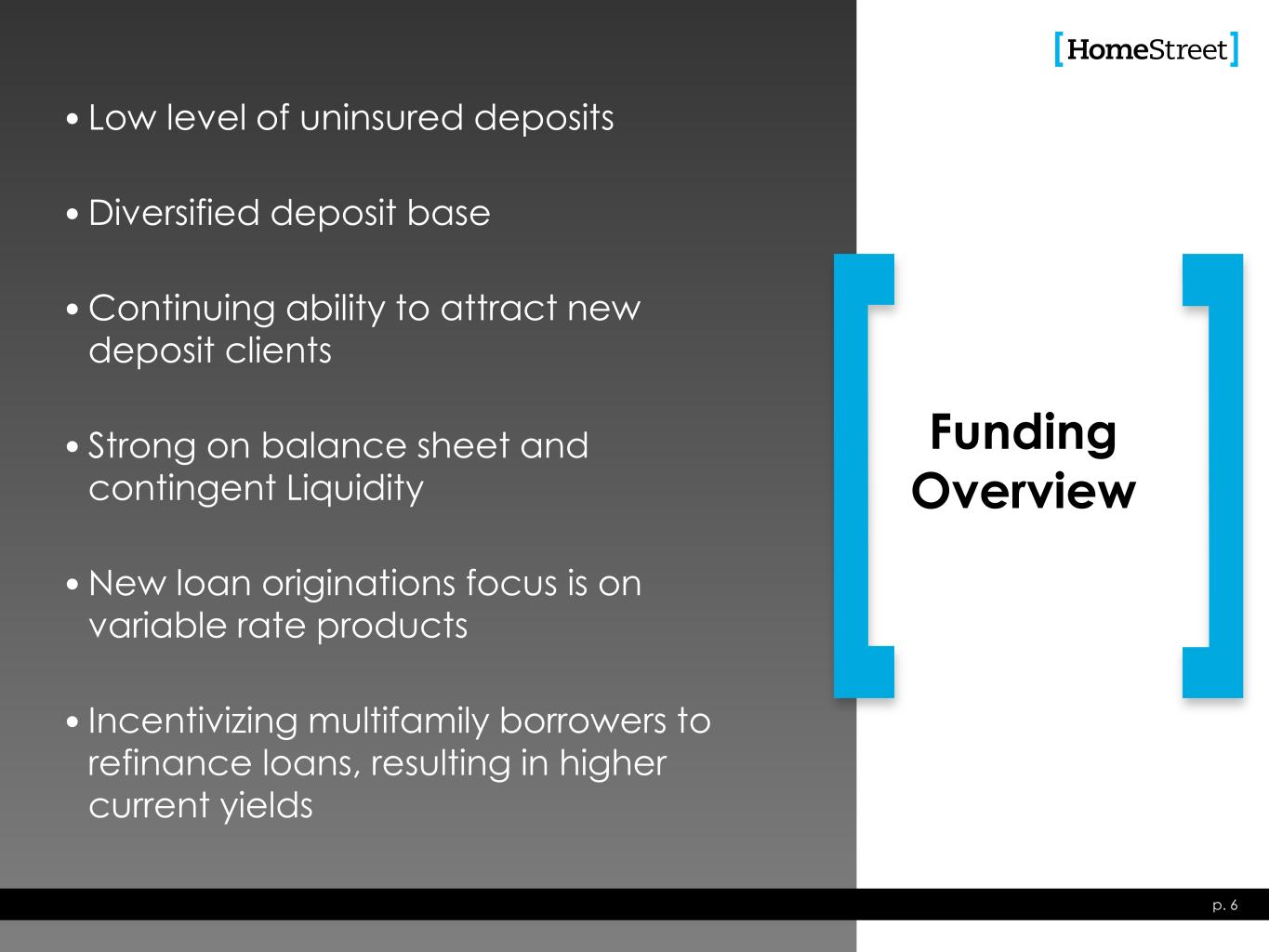 p. 6 • Low level of uninsured deposits • Diversified deposit base • Continuing ability to attract new deposit clients • Strong on balance sheet and contingent Liquidity • New loan originations focus is on variable rate products • Incentivizing multifamily borrowers to refinance loans, resulting in higher current yields Funding Overview