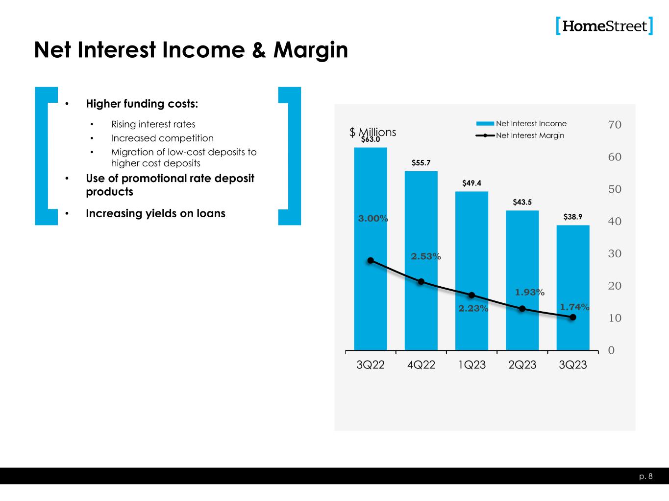 Highlights and Developments p. 2 Quarterly Results • Net income of $2.3 million, or $0.12 per share • Net interest margin of 1.74% • Loans held for investment remained stable • Excluding broker deposits, total deposits decreased $137 million to $5.8 billion • Uninsured deposits were $535 million as of September 30, 2023 (8% of total deposits) • Nonperforming assets to total assets 0.42% on September 30, 2023 • Book value per share of $26.74 and tangible book value per share of $26.18(1) on September 30, 2023 Year to date results • Net loss of $24.1 million, or $1.28 per share • Core net income of $10.5 million(1), or $0.56 per share • Net interest margin of 1.96% Other Results • Declared and paid a quarterly cash dividend of $0.10 per share HomeStreet’s results reflect the challenges of rising interest rates and competition for deposits. (1) See appendix for reconciliation of non-GAAP financial measures.