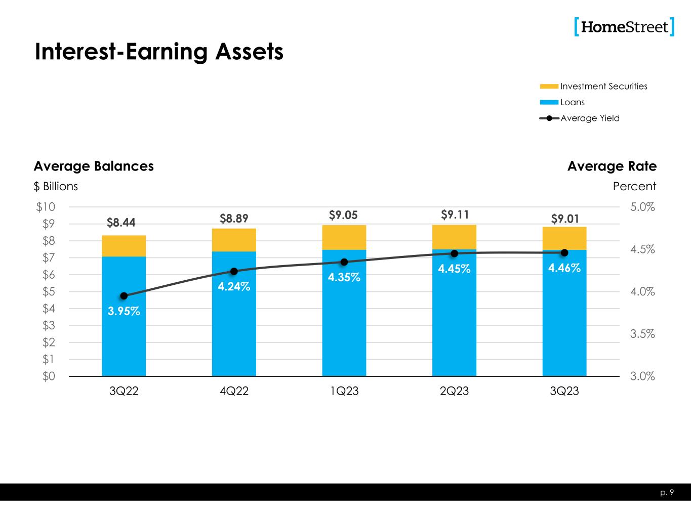 $63.0 $55.7 $49.4 $43.5 $38.93.00% 2.53% 2.23% 1.93% 1.74% 0 10 20 30 40 50 60 70 3Q22 4Q22 1Q23 2Q23 3Q23 Net Interest Income Net Interest Margin Net Interest Income & Margin p. 8 $ Millions • Higher funding costs: • Rising interest rates • Increased competition • Migration of low-cost deposits to higher cost deposits • Use of promotional rate deposit products • Increasing yields on loans