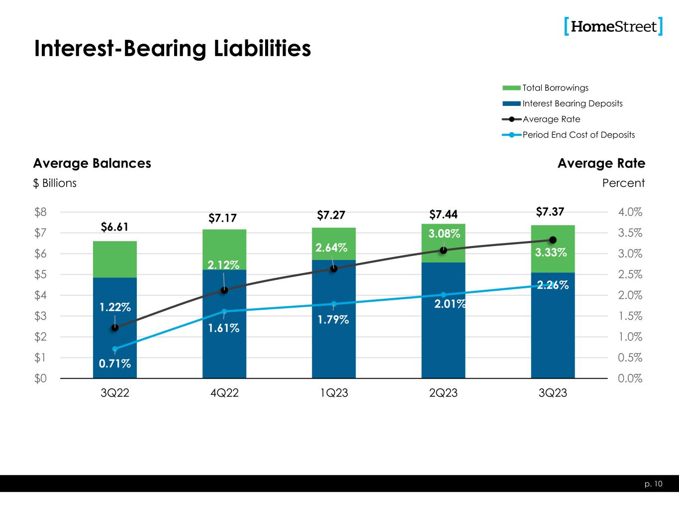 $8.44 $8.89 $9.05 $9.11 $9.01 3.95% 4.24% 4.35% 4.45% 4.46% 3.0% 3.5% 4.0% 4.5% 5.0% $0 $1 $2 $3 $4 $5 $6 $7 $8 $9 $10 3Q22 4Q22 1Q23 2Q23 3Q23 Investment Securities Loans Average Yield Interest-Earning Assets p. 9 Average Balances $ Billions Average Rate Percent