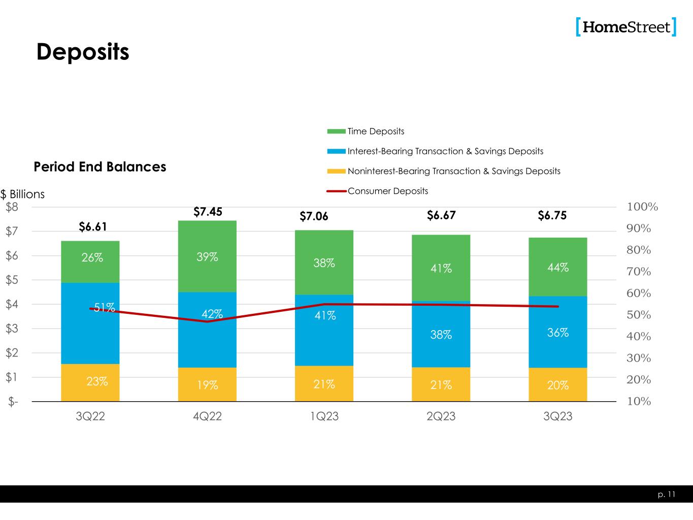$6.61 $7.17 $7.27 $7.44 $7.37 1.22% 2.12% 2.64% 3.08% 3.33% 0.71% 1.61% 1.79% 2.01% 2.26% 0.0% 0.5% 1.0% 1.5% 2.0% 2.5% 3.0% 3.5% 4.0% $0 $1 $2 $3 $4 $5 $6 $7 $8 3Q22 4Q22 1Q23 2Q23 3Q23 Total Borrowings Interest Bearing Deposits Average Rate Period End Cost of Deposits Interest-Bearing Liabilities Average Balances p. 10 $ Billions Average Rate Percent