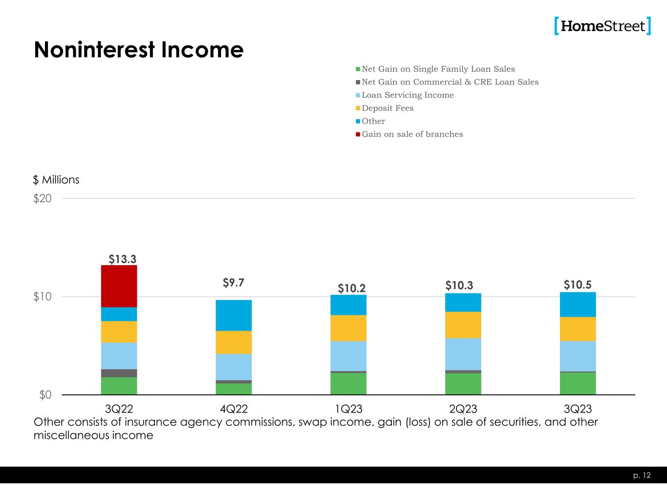 23% 19% 21% 21% 20% 51% 42% 41% 38% 36% 26% 39% 38% 41% 44% 10% 20% 30% 40% 50% 60% 70% 80% 90% 100% $- $1 $2 $3 $4 $5 $6 $7 $8 3Q22 4Q22 1Q23 2Q23 3Q23 Time Deposits Interest-Bearing Transaction & Savings Deposits Noninterest-Bearing Transaction & Savings Deposits Consumer Deposits Deposits p. 11 $6.61 $7.45 $7.06 $6.67 $6.75 Period End Balances $ Billions