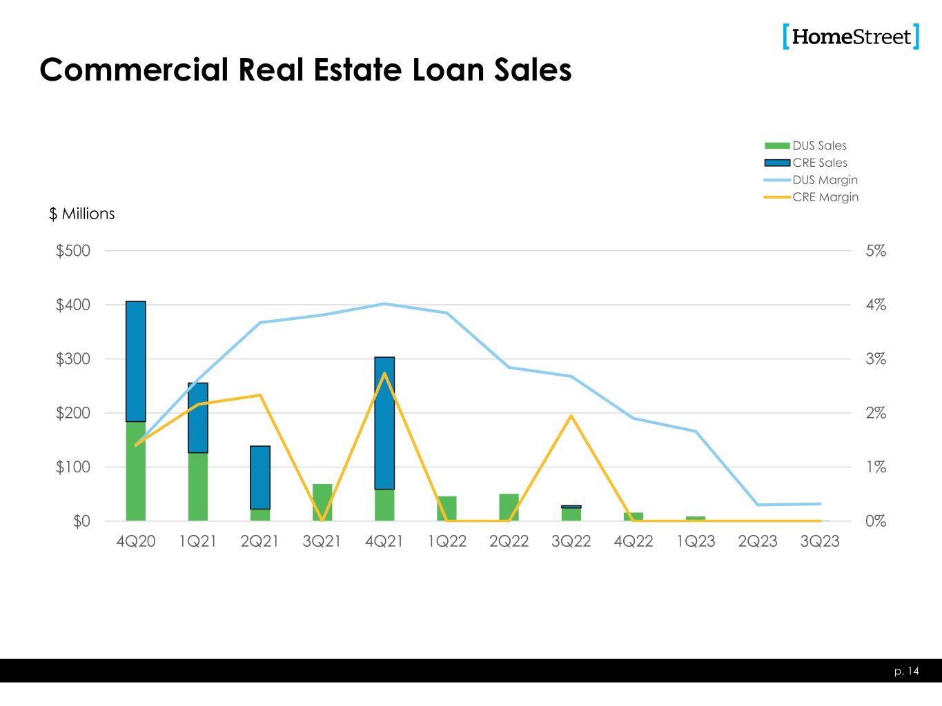 377 268 226 139 88 41 87 95 96 414 361 239 173 110 52 73 97 96 3.78% 3.94% 2.73% 2.84% 2.03% 2.84% 2.56% 2.28% 2.36% 0% 2% 4% 6% 8% 10% 12% 0 100 200 300 400 500 3Q21 4Q21 1Q22 2Q22 3Q22 4Q22 1Q23 2Q23 3Q23 Single Family Loan Sales Rate Locks Loans Closed GOS Margin Rate Locks/Loan Closings, $ in millions Margin% Single Family Mortgage Banking p. 13 3% 5% 7% 8% 8% 0% 10% 20% 30% 40% 3Q22 4Q22 1Q23 2Q23 3Q23 Single Family Mortgage Banking as a % of Total Revenues