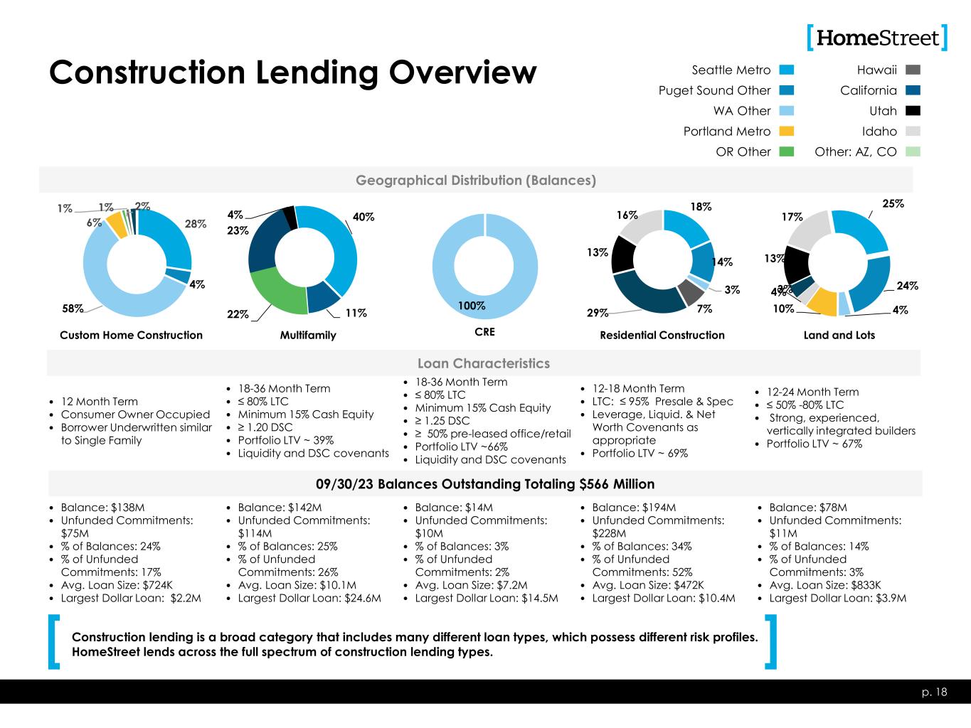 Permanent Commercial Real Estate Lending Overview • Up To 30 Year Term • $30MM Loan Amt. Max • ≥ 1.15 DSCR • Avg. LTV @ Orig. ~ 60% p. 17 Loan Characteristics • Up To 15 Year Term • $30MM Loan Amt. Max • ≥ 1.25 DSCR • Avg. LTV @ Orig. ~ 59% • Up To 15 Year Term • $30MM Loan Amt. Max • ≥ 1.25 DSCR • Avg. LTV @ Orig. ~ 61% • Up To 15 Year Term • $30MM Loan Amt. Max • ≥ 1.25 DSCR • Avg. LTV @ Orig. ~ 54% • Additional property types are reviewed on a case by case basis • Includes acquired loan types • Examples include: hotels, schools, churches, marinas • Balance: $4.0B • % of Balances: 79% • Portfolio Avg. LTV ~ 57%(1) • Portfolio Avg. DSCR ~ 1.38x • Avg. Loan Size: $5.4M • Largest Dollar Loan: $48.0M 09/30/23 Balances Outstanding Totaling $5.0 Billion • Balance: $224M • % of Balances: 5% • % Owner Occupied: 51% • Portfolio LTV ~ 48%(1) • Portfolio Avg. DSCR ~ 1.90x • Avg. Loan Size: $2.5M • Largest Dollar Loan: $21.3M • Balance: $374M • % of Balances: 7% • % Owner Occupied: 30% • Portfolio LTV ~ 51%(1) • Portfolio Avg. DSCR ~ 1.69x • Avg. Loan Size: $2.4M • Largest Dollar Loan: $23.4M • Balance: $298M • % of Balances: 6% • % Owner Occupied: 20% • Portfolio LTV ~ 46%(1) • Portfolio Avg. DSCR ~ 1.70x • Avg. Loan Size: $2.9M • Largest Dollar Loan: $15.4M • Balance: $167M • % of Balances: 3% • % of Owner Occupied: 84% • Portfolio LTV ~ 36%(1) • Portfolio Avg. DSCR ~ 2.14x • Avg. Loan Size: $3.7M • Largest Dollar Loan: $23.3M 46% 22% 8% 15% 6% 3% Geographical Distribution (Balances) Multifamily 15% 29% 1%3% 44% 8% Industrial / Warehouse 16% 13% 4% 6% 48% 13% Office 19% 26%9% 7% 37% 2% Retail 5% 5% 1% 78% 11% Other CA Los Angeles County CA Other Oregon Other WA King/Pierce/Snohomish WA Other (1) Property values as of origination date. • HomeStreet lends across the full spectrum of commercial real estate lending types, but is deliberate in its effort to achieve diversification among property types and geographic areas to mitigate concentration risk. • “Other” category includes loans secured by Schools ($80.0 million), Hotels ($28.4 million), and Churches ($11.4 million).