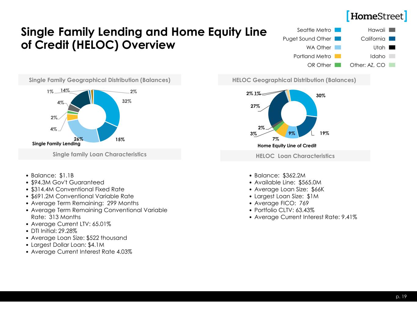 Construction Lending Overview • 12 Month Term • Consumer Owner Occupied • Borrower Underwritten similar to Single Family p. 18 Loan Characteristics • 18-36 Month Term • ≤ 80% LTC • Minimum 15% Cash Equity • ≥ 1.20 DSC • Portfolio LTV ~ 39% • Liquidity and DSC covenants • 18-36 Month Term • ≤ 80% LTC • Minimum 15% Cash Equity • ≥ 1.25 DSC • ≥ 50% pre-leased office/retail • Portfolio LTV ~66% • Liquidity and DSC covenants • 12-18 Month Term • LTC: ≤ 95% Presale & Spec • Leverage, Liquid. & Net Worth Covenants as appropriate • Portfolio LTV ~ 69% • 12-24 Month Term • ≤ 50% -80% LTC • Strong, experienced, vertically integrated builders • Portfolio LTV ~ 67% • Balance: $138M • Unfunded Commitments: $75M • % of Balances: 24% • % of Unfunded Commitments: 17% • Avg. Loan Size: $724K • Largest Dollar Loan: $2.2M 09/30/23 Balances Outstanding Totaling $566 Million • Balance: $142M • Unfunded Commitments: $114M • % of Balances: 25% • % of Unfunded Commitments: 26% • Avg. Loan Size: $10.1M • Largest Dollar Loan: $24.6M • Balance: $14M • Unfunded Commitments: $10M • % of Balances: 3% • % of Unfunded Commitments: 2% • Avg. Loan Size: $7.2M • Largest Dollar Loan: $14.5M • Balance: $194M • Unfunded Commitments: $228M • % of Balances: 34% • % of Unfunded Commitments: 52% • Avg. Loan Size: $472K • Largest Dollar Loan: $10.4M • Balance: $78M • Unfunded Commitments: $11M • % of Balances: 14% • % of Unfunded Commitments: 3% • Avg. Loan Size: $833K • Largest Dollar Loan: $3.9M 28% 4% 58% 6% 2%1% 1% Geographical Distribution (Balances) Custom Home Construction 40% 11%22% 23% 4% Multifamily 100% CRE 18% 14% 3% 7%29% 13% 16% Residential Construction 25% 24% 4%10% 3%4% 13% 17% Land and Lots Seattle Metro Puget Sound Other WA Other Portland Metro OR Other Hawaii California Utah Idaho Other: AZ, CO Construction lending is a broad category that includes many different loan types, which possess different risk profiles. HomeStreet lends across the full spectrum of construction lending types.