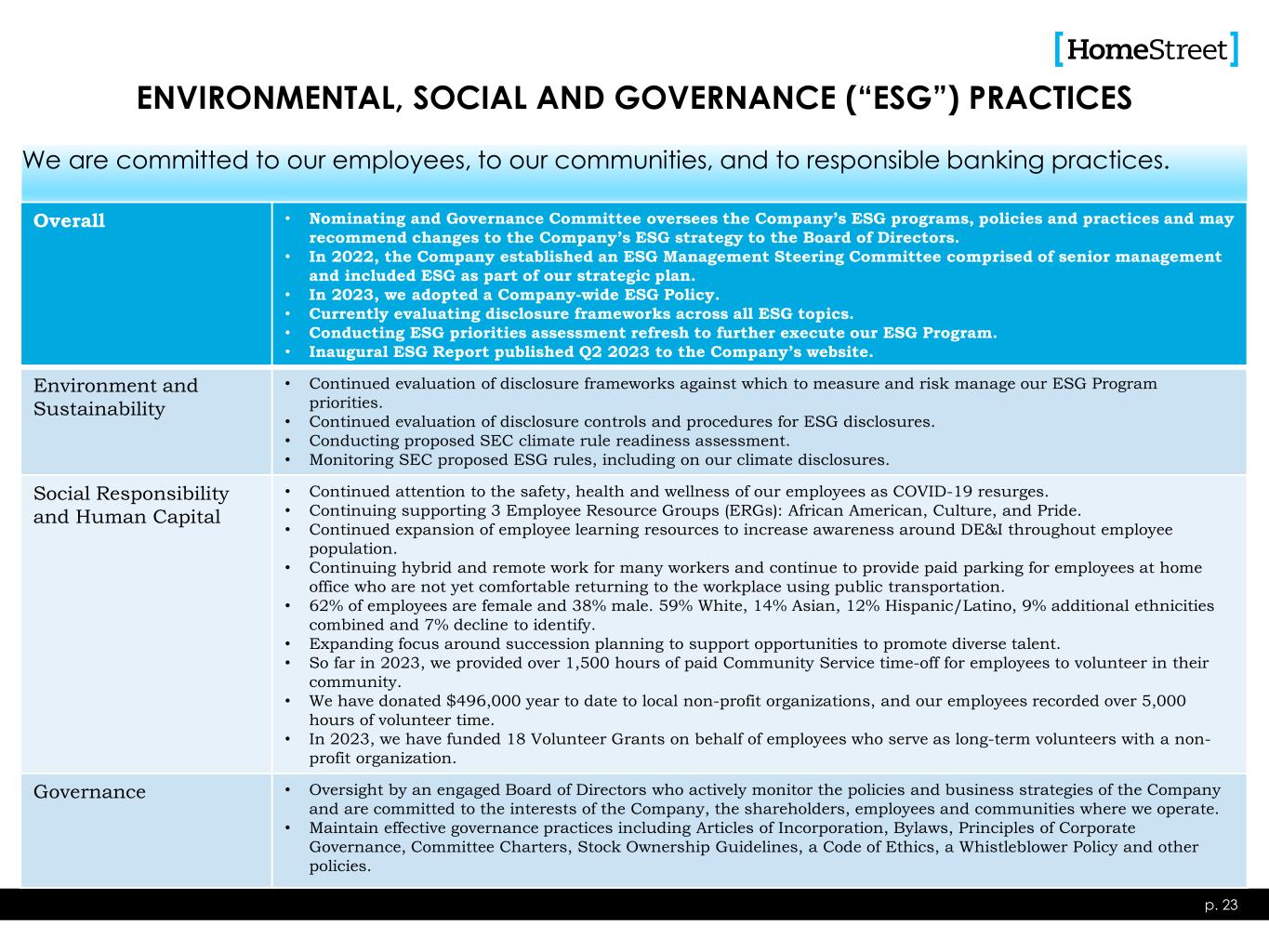 We are committed to our employees, to our communities, and to responsible banking practices. ENVIRONMENTAL, SOCIAL AND GOVERNANCE (“ESG”) PRACTICES p. 23 Overall • Nominating and Governance Committee oversees the Company’s ESG programs, policies and practices and may recommend changes to the Company’s ESG strategy to the Board of Directors. • In 2022, the Company established an ESG Management Steering Committee comprised of senior management and included ESG as part of our strategic plan. • In 2023, we adopted a Company-wide ESG Policy. • Currently evaluating disclosure frameworks across all ESG topics. • Conducting ESG priorities assessment refresh to further execute our ESG Program. • Inaugural ESG Report published Q2 2023 to the Company’s website. Environment and Sustainability • Continued evaluation of disclosure frameworks against which to measure and risk manage our ESG Program priorities. • Continued evaluation of disclosure controls and procedures for ESG disclosures. • Conducting proposed SEC climate rule readiness assessment. • Monitoring SEC proposed ESG rules, including on our climate disclosures. Social Responsibility and Human Capital • Continued attention to the safety, health and wellness of our employees as COVID-19 resurges. • Continuing supporting 3 Employee Resource Groups (ERGs): African American, Culture, and Pride. • Continued expansion of employee learning resources to increase awareness around DE&I throughout employee population. • Continuing hybrid and remote work for many workers and continue to provide paid parking for employees at home office who are not yet comfortable returning to the workplace using public transportation. • 62% of employees are female and 38% male. 59% White, 14% Asian, 12% Hispanic/Latino, 9% additional ethnicities combined and 7% decline to identify. • Expanding focus around succession planning to support opportunities to promote diverse talent. • So far in 2023, we provided over 1,500 hours of paid Community Service time-off for employees to volunteer in their community. • We have donated $496,000 year to date to local non-profit organizations, and our employees recorded over 5,000 hours of volunteer time. • In 2023, we have funded 18 Volunteer Grants on behalf of employees who serve as long-term volunteers with a non- profit organization. Governance • Oversight by an engaged Board of Directors who actively monitor the policies and business strategies of the Company and are committed to the interests of the Company, the shareholders, employees and communities where we operate. • Maintain effective governance practices including Articles of Incorporation, Bylaws, Principles of Corporate Governance, Committee Charters, Stock Ownership Guidelines, a Code of Ethics, a Whistleblower Policy and other policies.