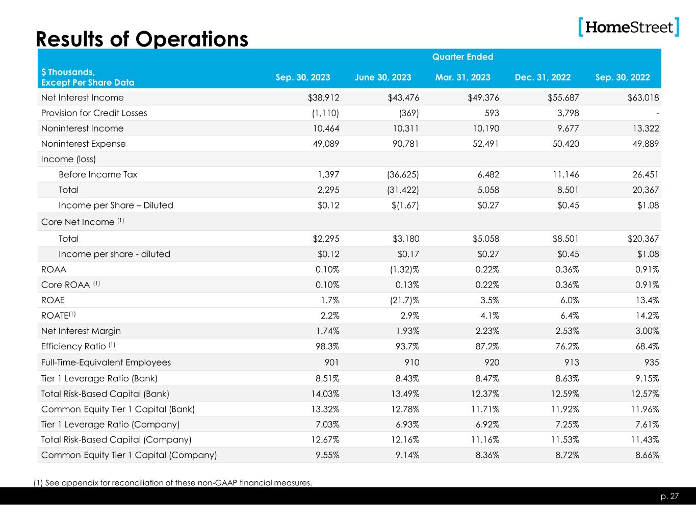 Results of Operations Quarter Ended $ Thousands, Except Per Share Data Sep. 30, 2023 June 30, 2023 Mar. 31, 2023 Dec. 31, 2022 Sep. 30, 2022 Net Interest Income $38,912 $43,476 $49,376 $55,687 $63,018 Provision for Credit Losses (1,110) (369) 593 3,798 - Noninterest Income 10,464 10,311 10,190 9,677 13,322 Noninterest Expense 49,089 90,781 52,491 50,420 49,889 Income (loss) Before Income Tax 1,397 (36,625) 6,482 11,146 26,451 Total 2,295 (31,422) 5,058 8,501 20,367 Income per Share – Diluted $0.12 $(1.67) $0.27 $0.45 $1.08 Core Net Income (1) Total $2,295 $3,180 $5,058 $8,501 $20,367 Income per share - diluted $0.12 $0.17 $0.27 $0.45 $1.08 ROAA 0.10% (1.32)% 0.22% 0.36% 0.91% Core ROAA (1) 0.10% 0.13% 0.22% 0.36% 0.91% ROAE 1.7% (21.7)% 3.5% 6.0% 13.4% ROATE(1) 2.2% 2.9% 4.1% 6.4% 14.2% Net Interest Margin 1.74% 1.93% 2.23% 2.53% 3.00% Efficiency Ratio (1) 98.3% 93.7% 87.2% 76.2% 68.4% Full-Time-Equivalent Employees 901 910 920 913 935 Tier 1 Leverage Ratio (Bank) 8.51% 8.43% 8.47% 8.63% 9.15% Total Risk-Based Capital (Bank) 14.03% 13.49% 12.37% 12.59% 12.57% Common Equity Tier 1 Capital (Bank) 13.32% 12.78% 11.71% 11.92% 11.96% Tier 1 Leverage Ratio (Company) 7.03% 6.93% 6.92% 7.25% 7.61% Total Risk-Based Capital (Company) 12.67% 12.16% 11.16% 11.53% 11.43% Common Equity Tier 1 Capital (Company) 9.55% 9.14% 8.36% 8.72% 8.66% p. 27 (1) See appendix for reconciliation of these non-GAAP financial measures.