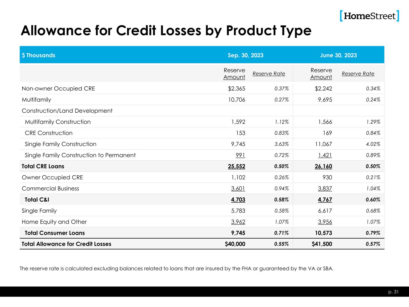 Allowance for Credit Losses by Product Type p. 31 $ Thousands Sep. 30, 2023 June 30, 2023 Reserve Amount Reserve Rate Reserve Amount Reserve Rate Non-owner Occupied CRE $2,365 0.37% $2,242 0.34% Multifamily 10,706 0.27% 9,695 0.24% Construction/Land Development Multifamily Construction 1,592 1.12% 1,566 1.29% CRE Construction 153 0.83% 169 0.84% Single Family Construction 9,745 3.63% 11,067 4.02% Single Family Construction to Permanent 991 0.72% 1,421 0.89% Total CRE Loans 25,552 0.50% 26,160 0.50% Owner Occupied CRE 1,102 0.26% 930 0.21% Commercial Business 3,601 0.94% 3,837 1.04% Total C&I 4,703 0.58% 4,767 0.60% Single Family 5,783 0.58% 6,617 0.68% Home Equity and Other 3,962 1.07% 3,956 1.07% Total Consumer Loans 9,745 0.71% 10,573 0.79% Total Allowance for Credit Losses $40,000 0.55% $41,500 0.57% The reserve rate is calculated excluding balances related to loans that are insured by the FHA or guaranteed by the VA or SBA.
