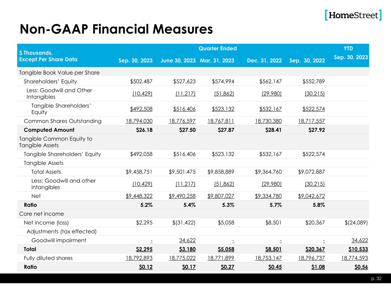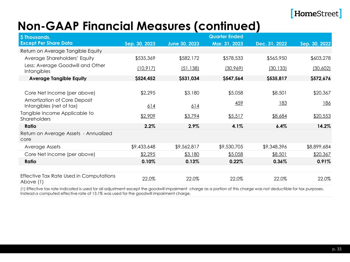 Non-GAAP Financial Measures $ Thousands, Except Per Share Data Quarter Ended YTD Sep. 30, 2023 June 30, 2023 Mar. 31, 2023 Dec. 31, 2022 Sep. 30, 2022 Sep. 30, 2023 Tangible Book Value per Share Shareholders’ Equity $502,487 $527,623 $574,994 $562,147 $552,789 Less: Goodwill and Other Intangibles (10,429) (11,217) (51,862) (29,980) (30,215) Tangible Shareholders’ Equity $492,508 $516,406 $523,132 $532,167 $522,574 Common Shares Outstanding 18,794,030 18,776,597 18,767,811 18,730,380 18,717,557 Computed Amount $26.18 $27.50 $27.87 $28.41 $27.92 Tangible Common Equity to Tangible Assets Tangible Shareholders’ Equity $492,058 $516,406 $523,132 $532,167 $522,574 Tangible Assets Total Assets $9,458,751 $9,501,475 $9,858,889 $9,364,760 $9,072,887 Less: Goodwill and other intangibles (10,429) (11,217) (51,862) (29,980) (30,215) Net $9,448,322 $9,490,258 $9,807,027 $9,334,780 $9,042,672 Ratio 5.2% 5.4% 5.3% 5.7% 5.8% Core net income Net income (loss) $2,295 $(31,422) $5,058 $8,501 $20,367 $(24,089) Adjustments (tax effected) Goodwill impairment - 34,622 - - - 34,622 Total $2,295 $3,180 $5,058 $8,501 $20,367 $10,533 Fully diluted shares 18,792,893 18,775,022 18,771,899 18,753,147 18,796,737 18,774,593 Ratio $0.12 $0.17 $0.27 $0.45 $1.08 $0.56 p. 32