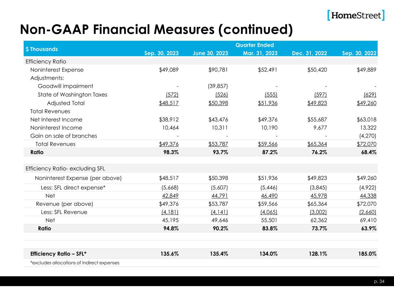Non-GAAP Financial Measures (continued) $ Thousands, Except Per Share Data Quarter Ended Sep. 30, 2023 June 30, 2023 Mar. 31, 2023 Dec. 31, 2022 Sep. 30, 2022 Return on Average Tangible Equity Average Shareholders’ Equity $535,369 $582,172 $578,533 $565,950 $603,278 Less: Average Goodwill and Other Intangibles (10,917) (51,138) (30,969) (30,133) (30,602) Average Tangible Equity $524,452 $531,034 $547,564 $535,817 $572,676 Core Net Income (per above) $2,295 $3,180 $5,058 $8,501 $20,367 Amortization of Core Deposit Intangibles (net of tax) 614 614 459 183 186 Tangible Income Applicable to Shareholders $2,909 $3,794 $5,517 $8,684 $20,553 Ratio 2.2% 2.9% 4.1% 6.4% 14.2% Return on Average Assets - Annualized core Average Assets $9,433,648 $9,562,817 $9,530,705 $9,348,396 $8,899,684 Core Net Income (per above) $2,295 $3,180 $5,058 $8,501 $20,367 Ratio 0.10% 0.13% 0.22% 0.36% 0.91% Effective Tax Rate Used in Computations Above (1) 22.0% 22.0% 22.0% 22.0% 22.0% (1) Effective tax rate indicated is used for all adjustment except the goodwill impairment charge as a portion of this charge was not deductible for tax purposes. Instead a computed effective rate of 13.1% was used for the goodwill impairment charge. p. 33