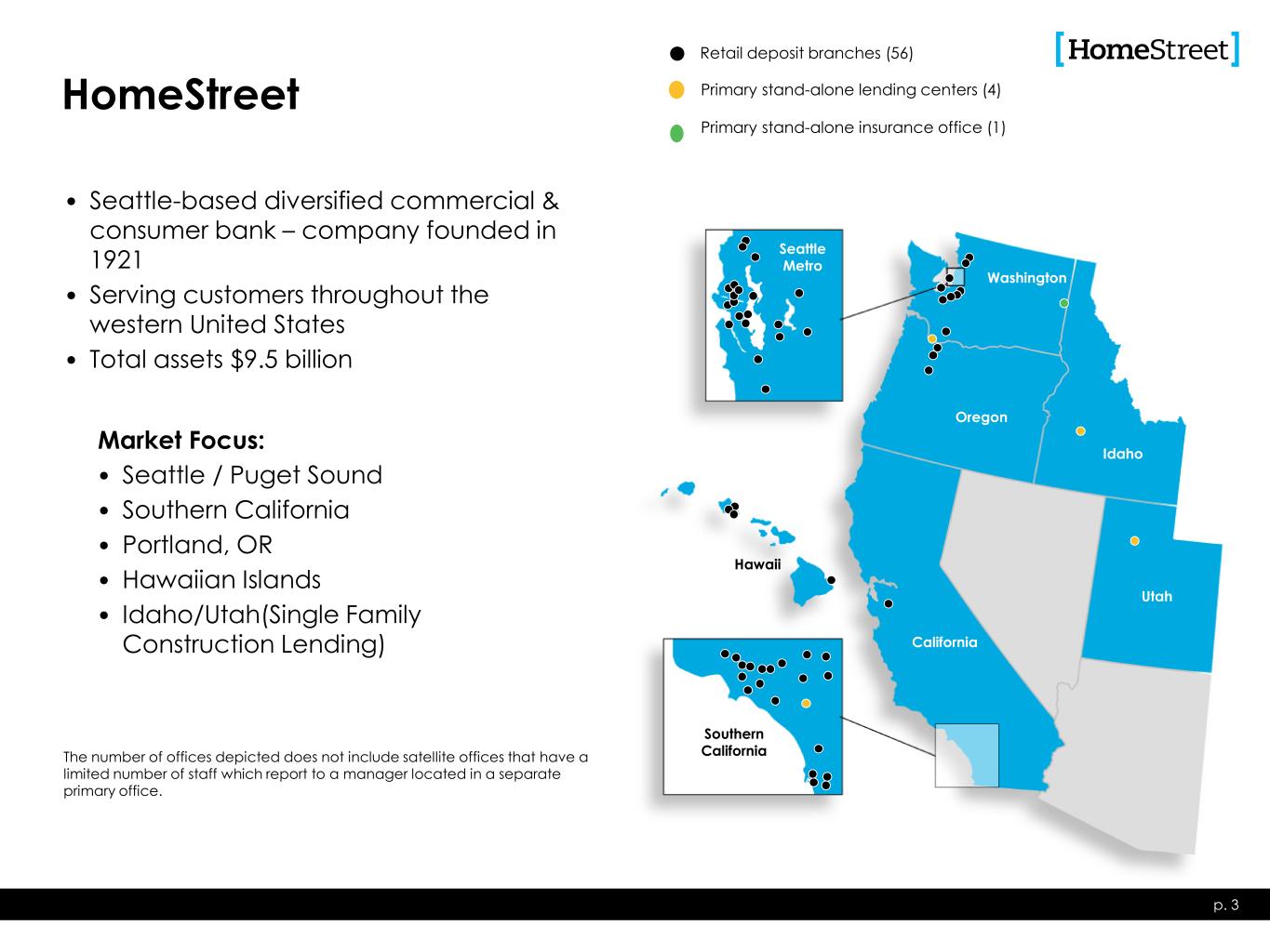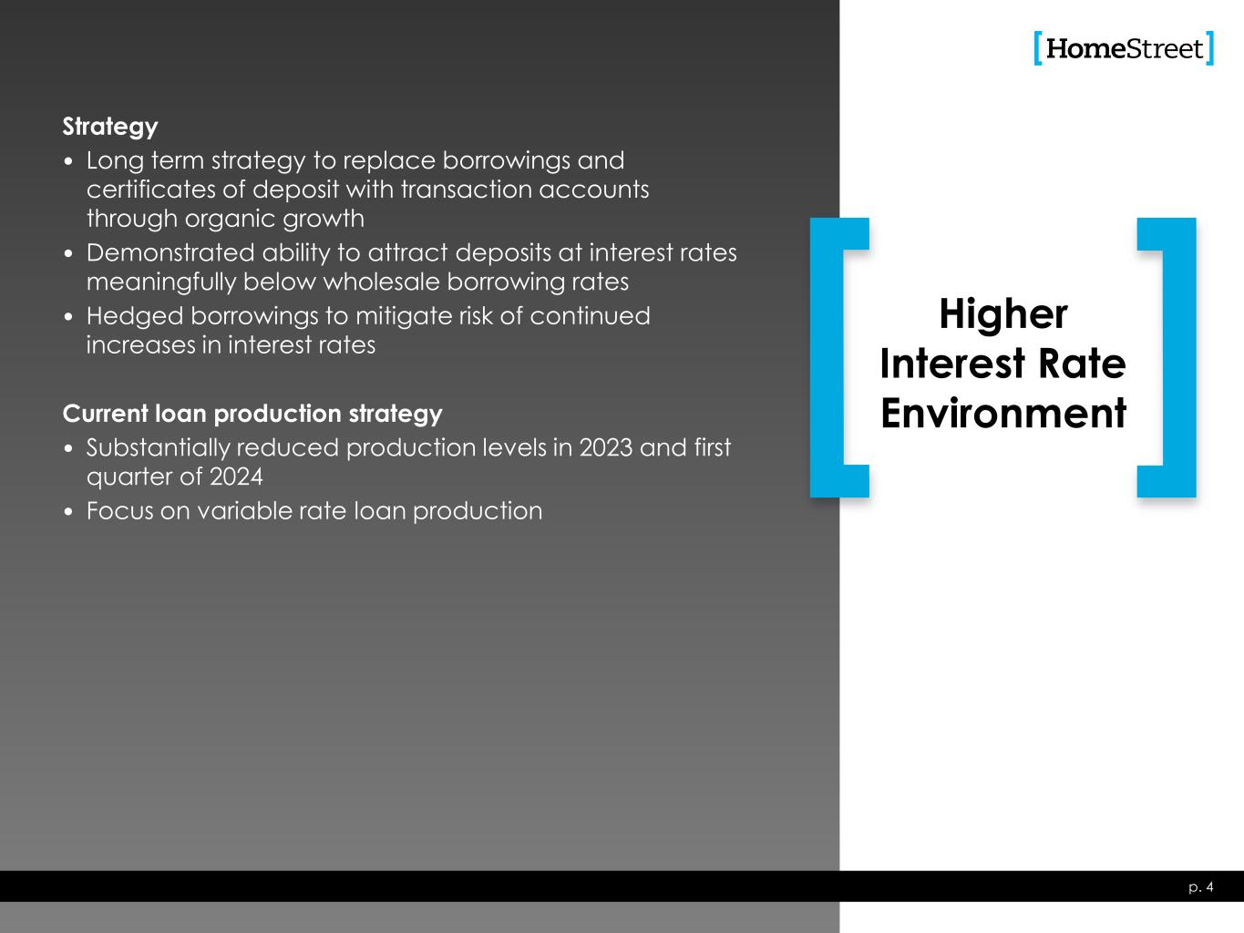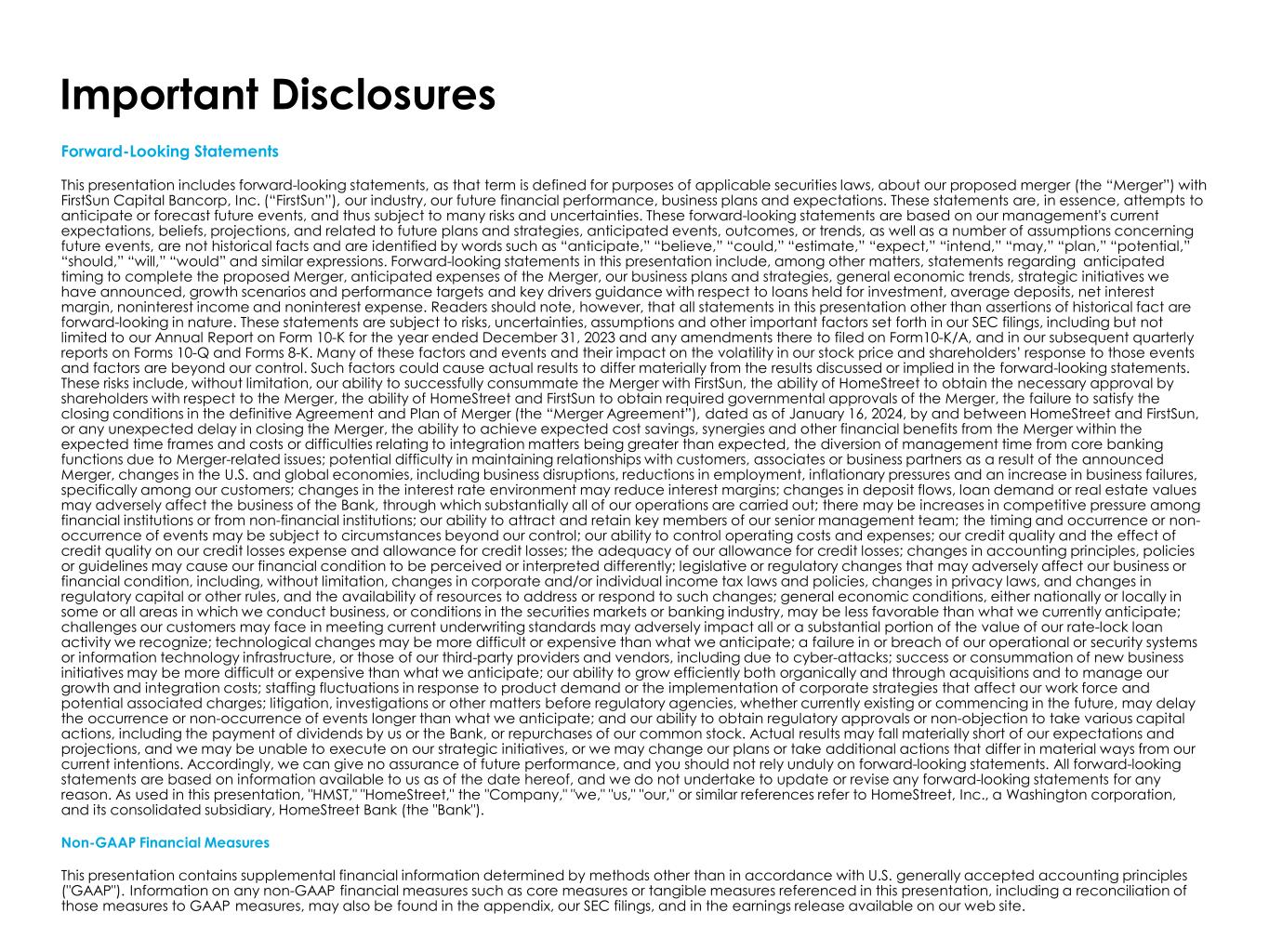 Important Disclosures Forward-Looking Statements This presentation includes forward-looking statements, as that term is defined for purposes of applicable securities laws, about our proposed merger (the “Merger”) with FirstSun Capital Bancorp, Inc. (“FirstSun”), our industry, our future financial performance, business plans and expectations. These statements are, in essence, attempts to anticipate or forecast future events, and thus subject to many risks and uncertainties. These forward-looking statements are based on our management's current expectations, beliefs, projections, and related to future plans and strategies, anticipated events, outcomes, or trends, as well as a number of assumptions concerning future events, are not historical facts and are identified by words such as “anticipate,” “believe,” “could,” “estimate,” “expect,” “intend,” “may,” “plan,” “potential,” “should,” “will,” “would” and similar expressions. Forward-looking statements in this presentation include, among other matters, statements regarding anticipated timing to complete the proposed Merger, anticipated expenses of the Merger, our business plans and strategies, general economic trends, strategic initiatives we have announced, growth scenarios and performance targets and key drivers guidance with respect to loans held for investment, average deposits, net interest margin, noninterest income and noninterest expense. Readers should note, however, that all statements in this presentation other than assertions of historical fact are forward-looking in nature. These statements are subject to risks, uncertainties, assumptions and other important factors set forth in our SEC filings, including but not limited to our Annual Report on Form 10-K for the year ended December 31, 2023 and any amendments there to filed on Form10-K/A, and in our subsequent quarterly reports on Forms 10-Q and Forms 8-K. Many of these factors and events and their impact on the volatility in our stock price and shareholders’ response to those events and factors are beyond our control. Such factors could cause actual results to differ materially from the results discussed or implied in the forward-looking statements. These risks include, without limitation, our ability to successfully consummate the Merger with FirstSun, the ability of HomeStreet to obtain the necessary approval by shareholders with respect to the Merger, the ability of HomeStreet and FirstSun to obtain required governmental approvals of the Merger, the failure to satisfy the closing conditions in the definitive Agreement and Plan of Merger (the “Merger Agreement”), dated as of January 16, 2024, by and between HomeStreet and FirstSun, or any unexpected delay in closing the Merger, the ability to achieve expected cost savings, synergies and other financial benefits from the Merger within the expected time frames and costs or difficulties relating to integration matters being greater than expected, the diversion of management time from core banking functions due to Merger-related issues; potential difficulty in maintaining relationships with customers, associates or business partners as a result of the announced Merger, changes in the U.S. and global economies, including business disruptions, reductions in employment, inflationary pressures and an increase in business failures, specifically among our customers; changes in the interest rate environment may reduce interest margins; changes in deposit flows, loan demand or real estate values may adversely affect the business of the Bank, through which substantially all of our operations are carried out; there may be increases in competitive pressure among financial institutions or from non-financial institutions; our ability to attract and retain key members of our senior management team; the timing and occurrence or non- occurrence of events may be subject to circumstances beyond our control; our ability to control operating costs and expenses; our credit quality and the effect of credit quality on our credit losses expense and allowance for credit losses; the adequacy of our allowance for credit losses; changes in accounting principles, policies or guidelines may cause our financial condition to be perceived or interpreted differently; legislative or regulatory changes that may adversely affect our business or financial condition, including, without limitation, changes in corporate and/or individual income tax laws and policies, changes in privacy laws, and changes in regulatory capital or other rules, and the availability of resources to address or respond to such changes; general economic conditions, either nationally or locally in some or all areas in which we conduct business, or conditions in the securities markets or banking industry, may be less favorable than what we currently anticipate; challenges our customers may face in meeting current underwriting standards may adversely impact all or a substantial portion of the value of our rate-lock loan activity we recognize; technological changes may be more difficult or expensive than what we anticipate; a failure in or breach of our operational or security systems or information technology infrastructure, or those of our third-party providers and vendors, including due to cyber-attacks; success or consummation of new business initiatives may be more difficult or expensive than what we anticipate; our ability to grow efficiently both organically and through acquisitions and to manage our growth and integration costs; staffing fluctuations in response to product demand or the implementation of corporate strategies that affect our work force and potential associated charges; litigation, investigations or other matters before regulatory agencies, whether currently existing or commencing in the future, may delay the occurrence or non-occurrence of events longer than what we anticipate; and our ability to obtain regulator