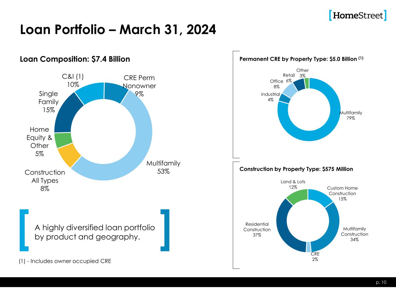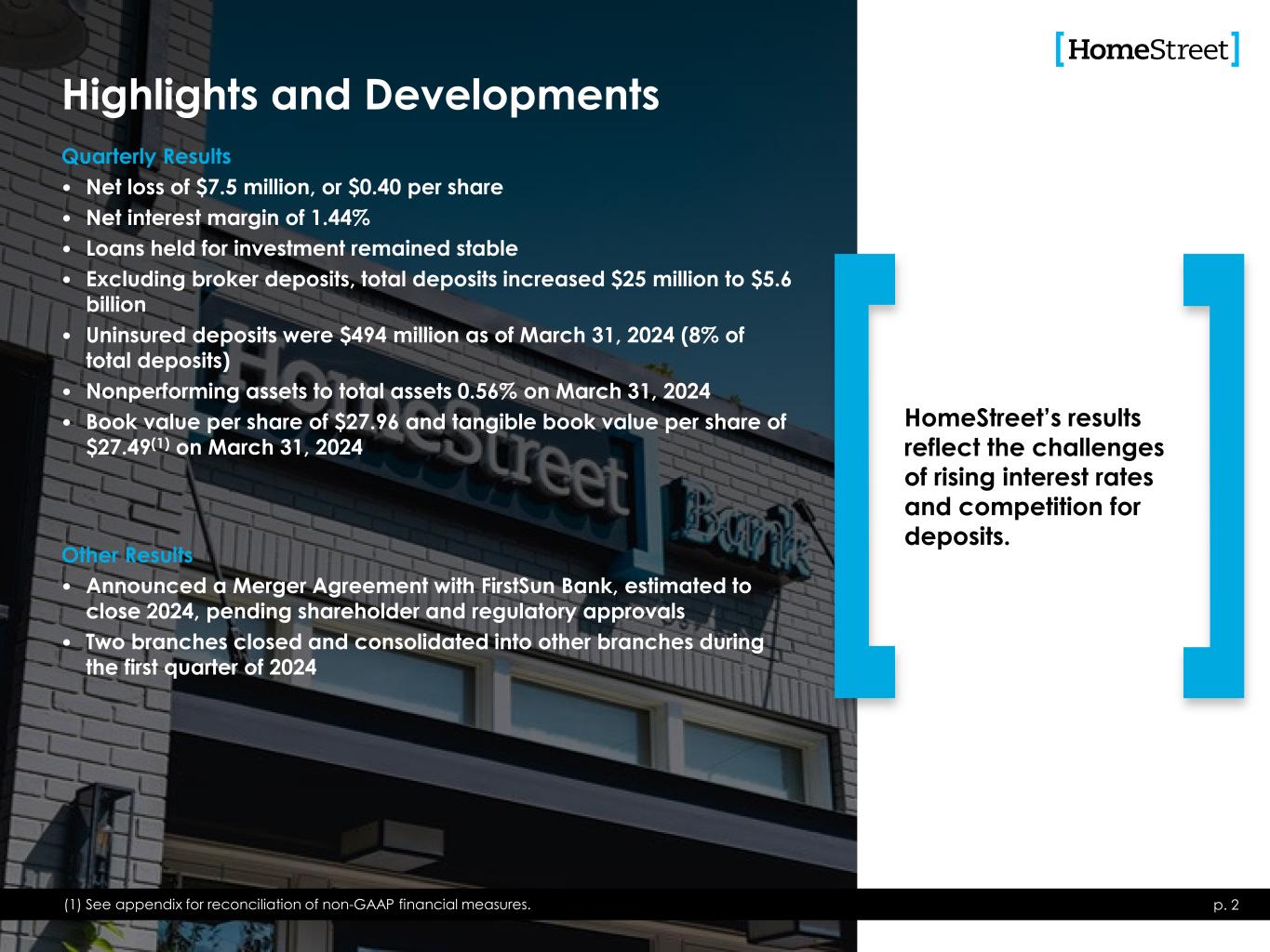 Highlights and Developments p. 2 Quarterly Results • Net loss of $7.5 million, or $0.40 per share • Net interest margin of 1.44% • Loans held for investment remained stable • Excluding broker deposits, total deposits increased $25 million to $5.6 billion • Uninsured deposits were $494 million as of March 31, 2024 (8% of total deposits) • Nonperforming assets to total assets 0.56% on March 31, 2024 • Book value per share of $27.96 and tangible book value per share of $27.49(1) on March 31, 2024 Other Results • Announced a Merger Agreement with FirstSun Bank, estimated to close 2024, pending shareholder and regulatory approvals • Two branches closed and consolidated into other branches during the first quarter of 2024 HomeStreet’s results reflect the challenges of rising interest rates and competition for deposits. (1) See appendix for reconciliation of non-GAAP financial measures.