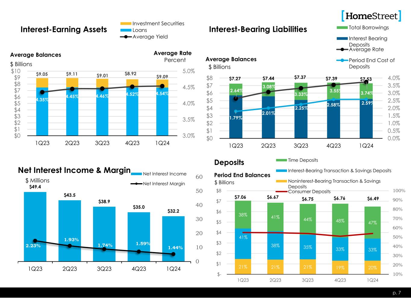 p. 6 Diversified Deposit Base: • The average balance of our noninterest-bearing consumer deposit accounts as of March 31, 2024, was $7,000 and overall average consumer deposit account balance was $28,000. • The average balance of our noninterest-bearing business deposit accounts as of March 31, 2024, was $64,000 and overall average business deposit account balance was $93,000. • As a percentage of our deposit portfolio, our top ten customers make up only 4.7% of our total deposit balances. • Uninsured deposits of $494 million as of March 31, 2024 (8% of total deposits) Continuing ability to attract new deposit clients • Our branch system added 123 new business customers in Q1 2024. • Commercial banking added 25 new customers in Q1 2024. Liquidity: • Our on-balance sheet liquidity as of March 31, 2024, was 14%. • Our available contingent liquidity borrowing sources ($5.1 billion) equal to 78% of the total amount of deposits outstanding as of March 31, 2024. • Optimizing funding costs by utilizing least cost option (borrowings / brokered deposits) Liquidity Considerations