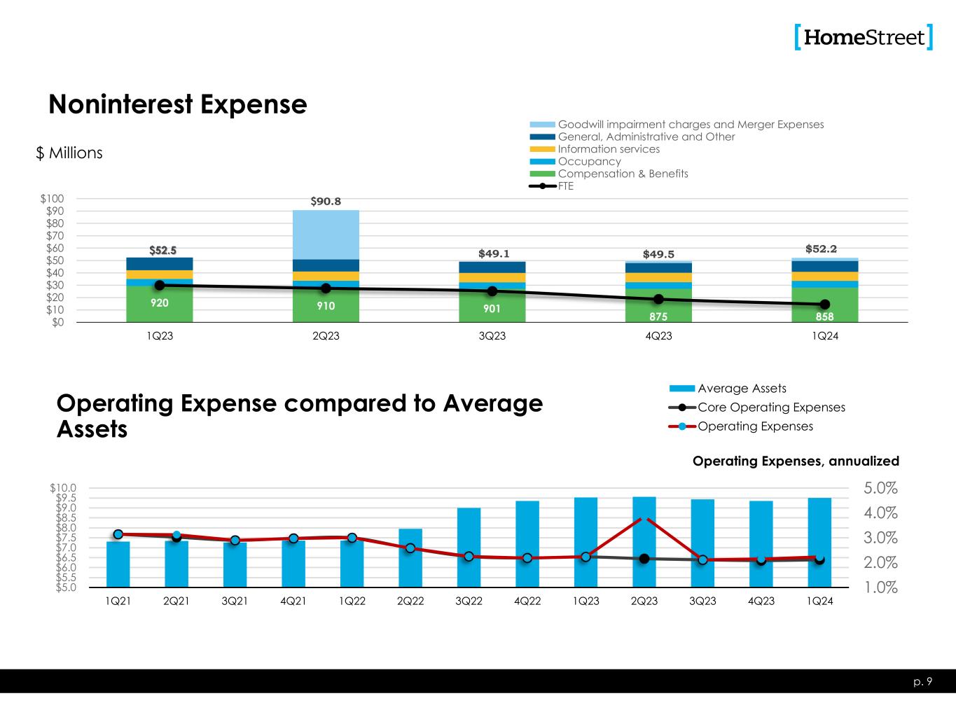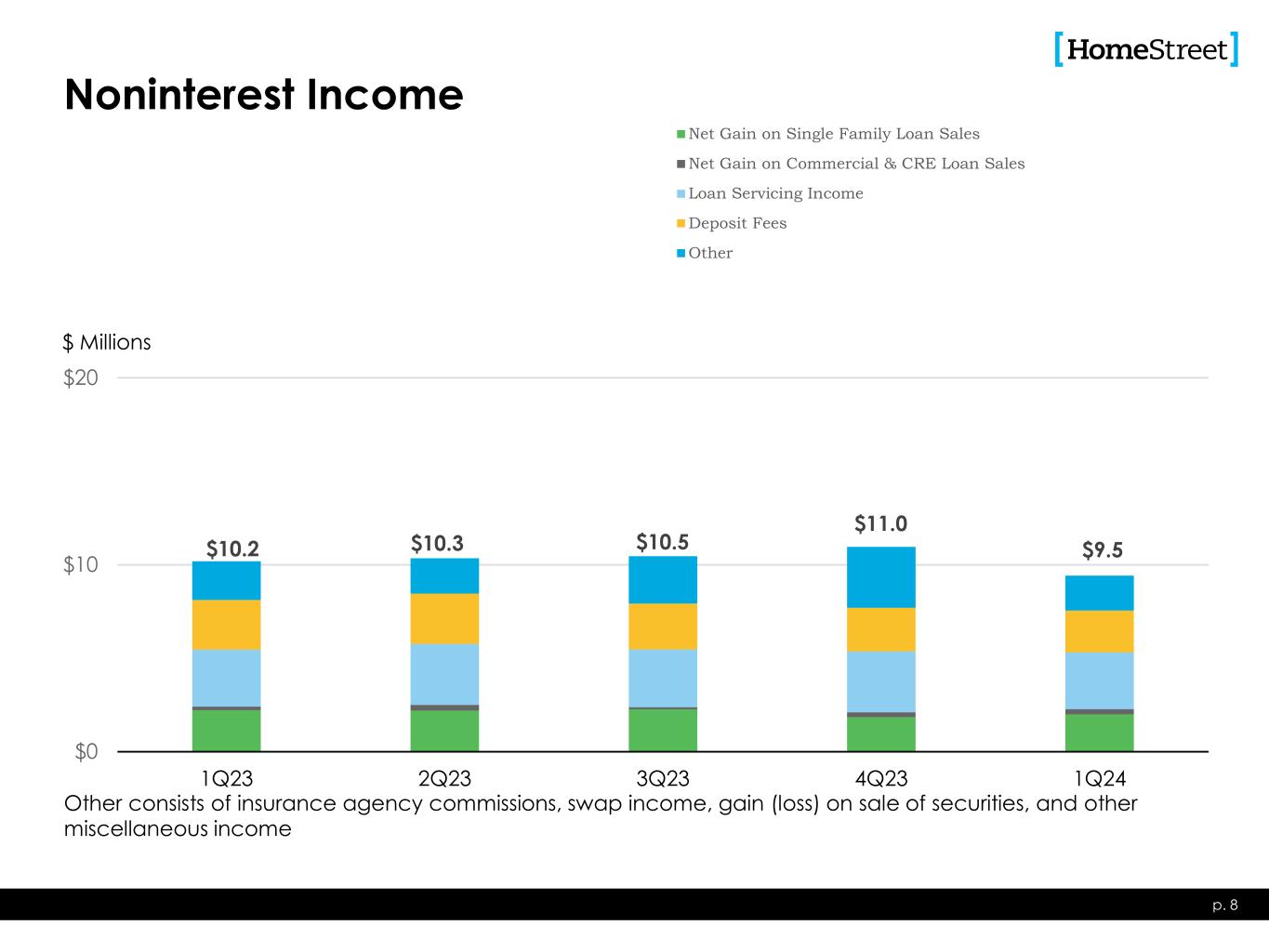 $10.2 $10.3 $10.5 $11.0 $9.5 $0 $10 $20 1Q23 2Q23 3Q23 4Q23 1Q24 Net Gain on Single Family Loan Sales Net Gain on Commercial & CRE Loan Sales Loan Servicing Income Deposit Fees Other Noninterest Income p. 8 $ Millions Other consists of insurance agency commissions, swap income, gain (loss) on sale of securities, and other miscellaneous income