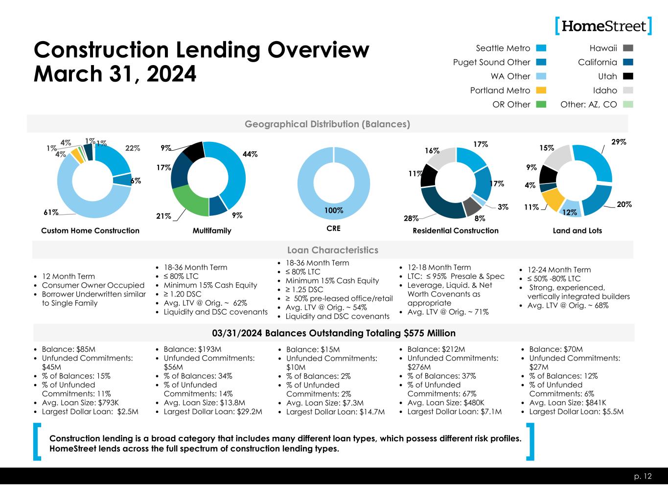 Permanent Commercial Real Estate Lending Overview March 31, 2024 • Up To 30 Year Term • $30MM Loan Amt. Max • ≥ 1.15 DSCR • Avg. LTV @ Orig. ~ 60% p. 11 Loan Characteristics • Up To 15 Year Term • $30MM Loan Amt. Max • ≥ 1.25 DSCR • Avg. LTV @ Orig. ~ 59% • Up To 15 Year Term • $30MM Loan Amt. Max • ≥ 1.25 DSCR • Avg. LTV @ Orig. ~ 65% • Up To 15 Year Term • $30MM Loan Amt. Max • ≥ 1.25 DSCR • Avg. LTV @ Orig. ~ 54% • Additional property types are reviewed on a case by case basis • Includes acquired loan types • Examples include: hotels, schools, churches, marinas • Balance: $3.9B • % of Balances: 79% • Portfolio Avg. LTV ~ 57%(1) • Portfolio Avg. DSCR ~ 1.51x • Avg. Loan Size: $5.4M • Largest Dollar Loan: $48.0M 03/31/2024 Balances Outstanding Totaling $5.0 Billion • Balance: $214M • % of Balances: 4% • % Owner Occupied: 51% • Portfolio LTV ~ 47%(1) • Portfolio Avg. DSCR ~ 2.18x • Avg. Loan Size: $2.5M • Largest Dollar Loan: $21.3M • Balance: $369M • % of Balances: 8% • % Owner Occupied: 29% • Portfolio LTV ~ 53%(1) • Portfolio Avg. DSCR ~ 1.61x • Avg. Loan Size: $2.4M • Largest Dollar Loan: $23.4M • Balance: $307M • % of Balances: 6% • % Owner Occupied: 24% • Portfolio LTV ~ 45%(1) • Portfolio Avg. DSCR ~ 1.70x • Avg. Loan Size: $2.9M • Largest Dollar Loan: $15.4M • Balance: $126M • % of Balances: 3% • % of Owner Occupied: 72% • Portfolio LTV ~ 38%(1) • Portfolio Avg. DSCR ~ 1.93x • Avg. Loan Size: $3.0M • Largest Dollar Loan: $20.0M 46% 22% 8% 15% 6% 3% Geographical Distribution (Balances) Multifamily 15% 29% 2%2% 44% 8% Industrial / Warehouse 16% 14% 4% 6% 47% 13% Office 18% 24%8% 7% 41% 2% Retail 8% 7% 1% 70% 14% Other CA Los Angeles County CA Other Oregon Other WA King/Pierce/Snohomish WA Other (1) Property values as of origination date. • HomeStreet lends across the full spectrum of commercial real estate lending types, but is deliberate in its effort to achieve diversification among property types and geographic areas to mitigate concentration risk. • “Other” category includes loans secured by Schools ($55.5 million), Hotels ($12.6 million), and Churches ($10.1 million).
