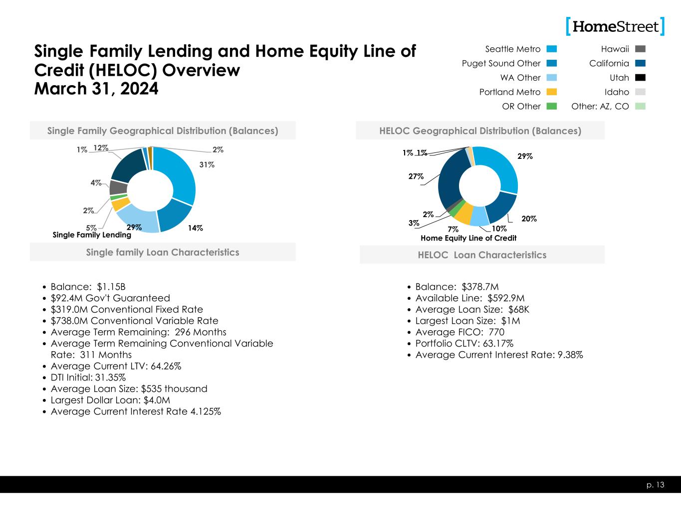Construction Lending Overview March 31, 2024 • 12 Month Term • Consumer Owner Occupied • Borrower Underwritten similar to Single Family p. 12 Loan Characteristics • 18-36 Month Term • ≤ 80% LTC • Minimum 15% Cash Equity • ≥ 1.20 DSC • Avg. LTV @ Orig. ~ 62% • Liquidity and DSC covenants • 18-36 Month Term • ≤ 80% LTC • Minimum 15% Cash Equity • ≥ 1.25 DSC • ≥ 50% pre-leased office/retail • Avg. LTV @ Orig. ~ 54% • Liquidity and DSC covenants • 12-18 Month Term • LTC: ≤ 95% Presale & Spec • Leverage, Liquid. & Net Worth Covenants as appropriate • Avg. LTV @ Orig. ~ 71% • 12-24 Month Term • ≤ 50% -80% LTC • Strong, experienced, vertically integrated builders • Avg. LTV @ Orig. ~ 68% • Balance: $85M • Unfunded Commitments: $45M • % of Balances: 15% • % of Unfunded Commitments: 11% • Avg. Loan Size: $793K • Largest Dollar Loan: $2.5M 03/31/2024 Balances Outstanding Totaling $575 Million • Balance: $193M • Unfunded Commitments: $56M • % of Balances: 34% • % of Unfunded Commitments: 14% • Avg. Loan Size: $13.8M • Largest Dollar Loan: $29.2M • Balance: $15M • Unfunded Commitments: $10M • % of Balances: 2% • % of Unfunded Commitments: 2% • Avg. Loan Size: $7.3M • Largest Dollar Loan: $14.7M • Balance: $212M • Unfunded Commitments: $276M • % of Balances: 37% • % of Unfunded Commitments: 67% • Avg. Loan Size: $480K • Largest Dollar Loan: $7.1M • Balance: $70M • Unfunded Commitments: $27M • % of Balances: 12% • % of Unfunded Commitments: 6% • Avg. Loan Size: $841K • Largest Dollar Loan: $5.5M 22% 6% 61% 4% 1% 1% 4% 1% Geographical Distribution (Balances) Custom Home Construction 44% 9%21% 17% 9% Multifamily 100% CRE 17% 17% 3% 8%28% 11% 16% Residential Construction 29% 20% 12%11% 4% 9% 15% Land and Lots Seattle Metro Puget Sound Other WA Other Portland Metro OR Other Hawaii California Utah Idaho Other: AZ, CO Construction lending is a broad category that includes many different loan types, which possess different risk profiles. HomeStreet lends across the full spectrum of construction lending types.