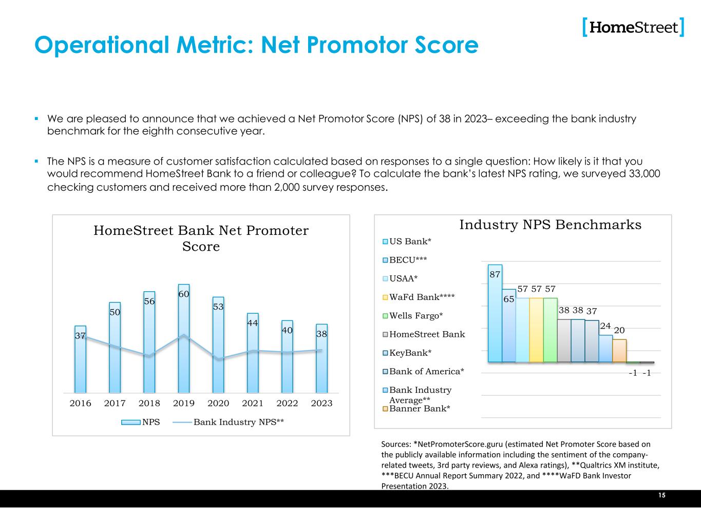 The content Operational Metric: Net Promotor Score  We are pleased to announce that we achieved a Net Promotor Score (NPS) of 38 in 2023– exceeding the bank industry benchmark for the eighth consecutive year.  The NPS is a measure of customer satisfaction calculated based on responses to a single question: How likely is it that you would recommend HomeStreet Bank to a friend or colleague? To calculate the bank’s latest NPS rating, we surveyed 33,000 checking customers and received more than 2,000 survey responses. 15 37 50 56 60 53 44 40 38 2016 2017 2018 2019 2020 2021 2022 2023 HomeStreet Bank Net Promoter Score NPS Bank Industry NPS** 87 65 57 57 57 38 38 37 24 20 -1 -1 Industry NPS Benchmarks US Bank* BECU*** USAA* WaFd Bank**** Wells Fargo* HomeStreet Bank KeyBank* Bank of America* Bank Industry Average** Banner Bank* Sources: *NetPromoterScore.guru (estimated Net Promoter Score based on the publicly available information including the sentiment of the company- related tweets, 3rd party reviews, and Alexa ratings), **Qualtrics XM institute, ***BECU Annual Report Summary 2022, and ****WaFD Bank Investor Presentation 2023.