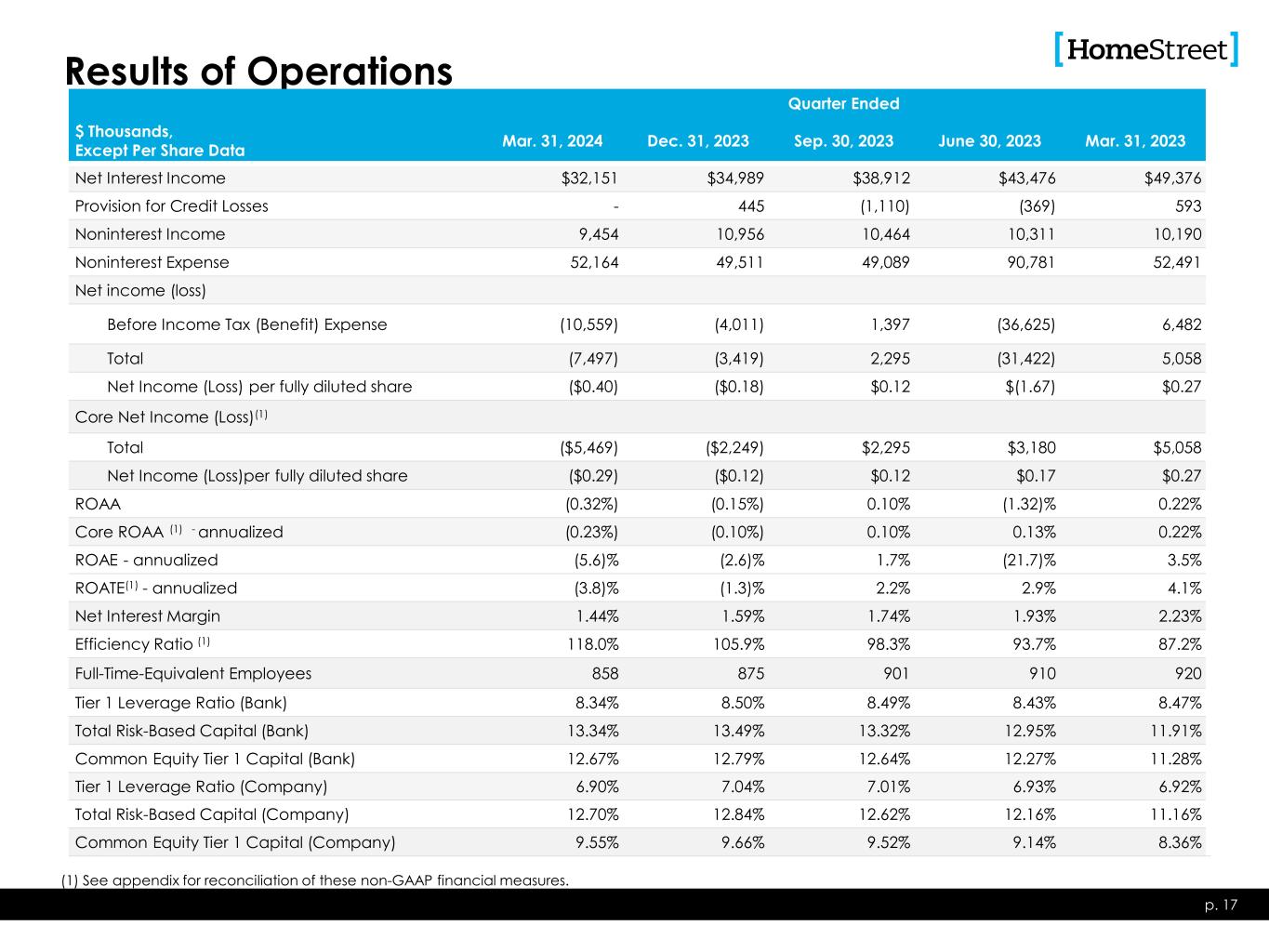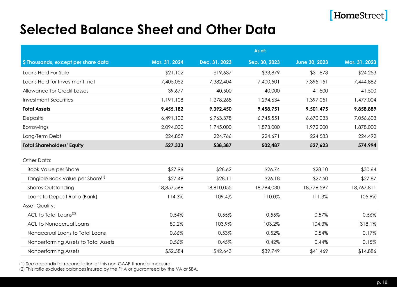Results of Operations Quarter Ended $ Thousands, Except Per Share Data Mar. 31, 2024 Dec. 31, 2023 Sep. 30, 2023 June 30, 2023 Mar. 31, 2023 Net Interest Income $32,151 $34,989 $38,912 $43,476 $49,376 Provision for Credit Losses - 445 (1,110) (369) 593 Noninterest Income 9,454 10,956 10,464 10,311 10,190 Noninterest Expense 52,164 49,511 49,089 90,781 52,491 Net income (loss) Before Income Tax (Benefit) Expense (10,559) (4,011) 1,397 (36,625) 6,482 Total (7,497) (3,419) 2,295 (31,422) 5,058 Net Income (Loss) per fully diluted share ($0.40) ($0.18) $0.12 $(1.67) $0.27 Core Net Income (Loss)(1) Total ($5,469) ($2,249) $2,295 $3,180 $5,058 Net Income (Loss)per fully diluted share ($0.29) ($0.12) $0.12 $0.17 $0.27 ROAA (0.32%) (0.15%) 0.10% (1.32)% 0.22% Core ROAA (1) - annualized (0.23%) (0.10%) 0.10% 0.13% 0.22% ROAE - annualized (5.6)% (2.6)% 1.7% (21.7)% 3.5% ROATE(1) - annualized (3.8)% (1.3)% 2.2% 2.9% 4.1% Net Interest Margin 1.44% 1.59% 1.74% 1.93% 2.23% Efficiency Ratio (1) 118.0% 105.9% 98.3% 93.7% 87.2% Full-Time-Equivalent Employees 858 875 901 910 920 Tier 1 Leverage Ratio (Bank) 8.34% 8.50% 8.49% 8.43% 8.47% Total Risk-Based Capital (Bank) 13.34% 13.49% 13.32% 12.95% 11.91% Common Equity Tier 1 Capital (Bank) 12.67% 12.79% 12.64% 12.27% 11.28% Tier 1 Leverage Ratio (Company) 6.90% 7.04% 7.01% 6.93% 6.92% Total Risk-Based Capital (Company) 12.70% 12.84% 12.62% 12.16% 11.16% Common Equity Tier 1 Capital (Company) 9.55% 9.66% 9.52% 9.14% 8.36% p. 17 (1) See appendix for reconciliation of these non-GAAP financial measures.