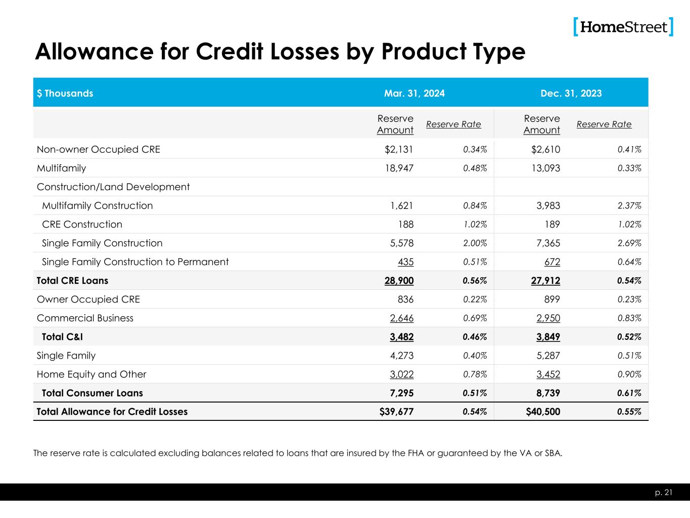 Allowance for Credit Losses by Product Type p. 21 $ Thousands Mar. 31, 2024 Dec. 31, 2023 Reserve Amount Reserve Rate Reserve Amount Reserve Rate Non-owner Occupied CRE $2,131 0.34% $2,610 0.41% Multifamily 18,947 0.48% 13,093 0.33% Construction/Land Development Multifamily Construction 1,621 0.84% 3,983 2.37% CRE Construction 188 1.02% 189 1.02% Single Family Construction 5,578 2.00% 7,365 2.69% Single Family Construction to Permanent 435 0.51% 672 0.64% Total CRE Loans 28,900 0.56% 27,912 0.54% Owner Occupied CRE 836 0.22% 899 0.23% Commercial Business 2,646 0.69% 2,950 0.83% Total C&I 3,482 0.46% 3,849 0.52% Single Family 4,273 0.40% 5,287 0.51% Home Equity and Other 3,022 0.78% 3,452 0.90% Total Consumer Loans 7,295 0.51% 8,739 0.61% Total Allowance for Credit Losses $39,677 0.54% $40,500 0.55% The reserve rate is calculated excluding balances related to loans that are insured by the FHA or guaranteed by the VA or SBA.