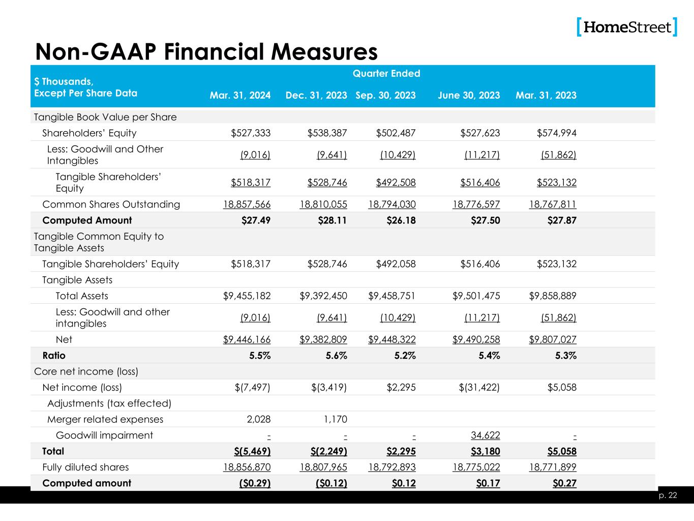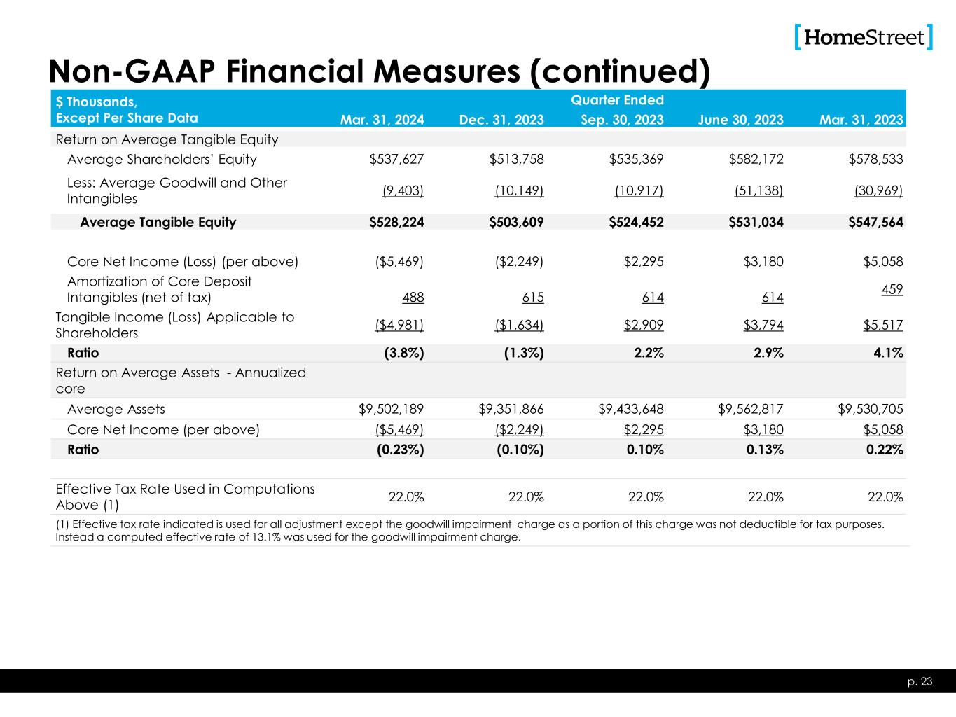 Non-GAAP Financial Measures $ Thousands, Except Per Share Data Quarter Ended Mar. 31, 2024 Dec. 31, 2023 Sep. 30, 2023 June 30, 2023 Mar. 31, 2023 Tangible Book Value per Share Shareholders’ Equity $527,333 $538,387 $502,487 $527,623 $574,994 Less: Goodwill and Other Intangibles (9,016) (9,641) (10,429) (11,217) (51,862) Tangible Shareholders’ Equity $518,317 $528,746 $492,508 $516,406 $523,132 Common Shares Outstanding 18,857,566 18,810,055 18,794,030 18,776,597 18,767,811 Computed Amount $27.49 $28.11 $26.18 $27.50 $27.87 Tangible Common Equity to Tangible Assets Tangible Shareholders’ Equity $518,317 $528,746 $492,058 $516,406 $523,132 Tangible Assets Total Assets $9,455,182 $9,392,450 $9,458,751 $9,501,475 $9,858,889 Less: Goodwill and other intangibles (9,016) (9,641) (10,429) (11,217) (51,862) Net $9,446,166 $9,382,809 $9,448,322 $9,490,258 $9,807,027 Ratio 5.5% 5.6% 5.2% 5.4% 5.3% Core net income (loss) Net income (loss) $(7,497) $(3,419) $2,295 $(31,422) $5,058 Adjustments (tax effected) Merger related expenses 2,028 1,170 Goodwill impairment - - - 34,622 - Total $(5,469) $(2,249) $2,295 $3,180 $5,058 Fully diluted shares 18,856,870 18,807,965 18,792,893 18,775,022 18,771,899 Computed amount ($0.29) ($0.12) $0.12 $0.17 $0.27 p. 22