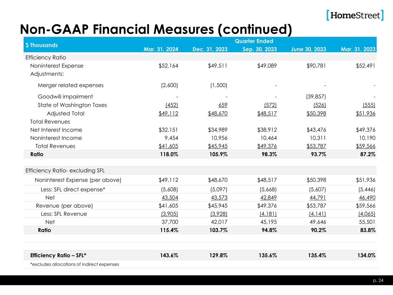 Non-GAAP Financial Measures (continued) $ Thousands Quarter Ended Mar. 31, 2024 Dec. 31, 2023 Sep. 30, 2023 June 30, 2023 Mar. 31, 2023 Efficiency Ratio Noninterest Expense $52,164 $49,511 $49,089 $90,781 $52,491 Adjustments: Merger related expenses (2,600) (1,500) - - - Goodwill impairment - - - (39,857) - State of Washington Taxes (452) 659 (572) (526) (555) Adjusted Total $49,112 $48,670 $48,517 $50,398 $51,936 Total Revenues Net Interest Income $32,151 $34,989 $38,912 $43,476 $49,376 Noninterest Income 9,454 10,956 10,464 10,311 10,190 Total Revenues $41,605 $45,945 $49,376 $53,787 $59,566 Ratio 118.0% 105.9% 98.3% 93.7% 87.2% Efficiency Ratio- excluding SFL Noninterest Expense (per above) $49,112 $48,670 $48,517 $50,398 $51,936 Less: SFL direct expense* (5,608) (5,097) (5,668) (5,607) (5,446) Net 43,504 43,573 42,849 44,791 46.490 Revenue (per above) $41,605 $45,945 $49,376 $53,787 $59,566 Less: SFL Revenue (3,905) (3,928) (4,181) (4,141) (4,065) Net 37,700 42,017 45,195 49,646 55,501 Ratio 115.4% 103.7% 94.8% 90.2% 83.8% Efficiency Ratio – SFL* 143.6% 129.8% 135.6% 135.4% 134.0% *excludes allocations of indirect expenses p. 24