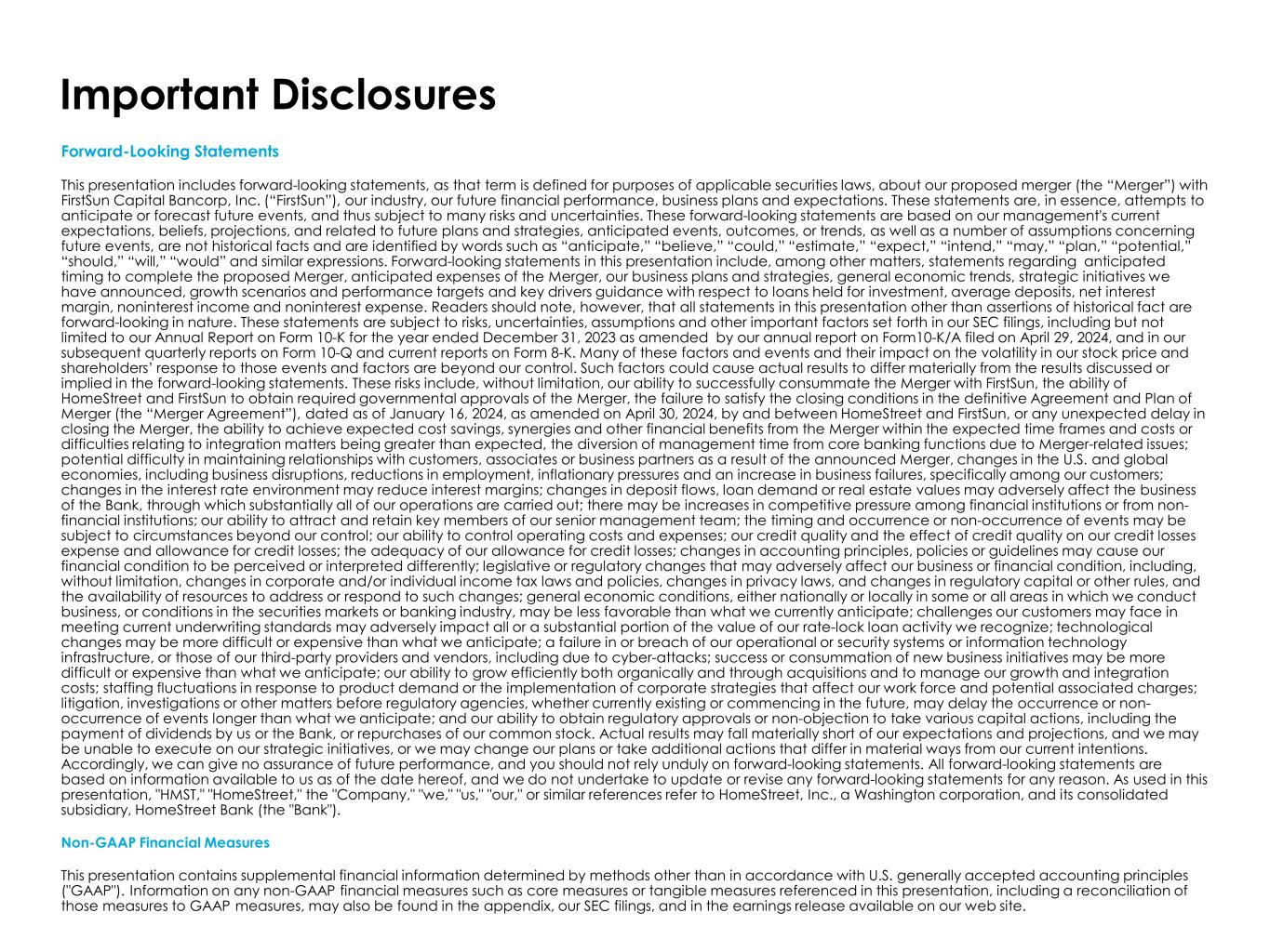 Important Disclosures Forward-Looking Statements This presentation includes forward-looking statements, as that term is defined for purposes of applicable securities laws, about our proposed merger (the “Merger”) with FirstSun Capital Bancorp, Inc. (“FirstSun”), our industry, our future financial performance, business plans and expectations. These statements are, in essence, attempts to anticipate or forecast future events, and thus subject to many risks and uncertainties. These forward-looking statements are based on our management's current expectations, beliefs, projections, and related to future plans and strategies, anticipated events, outcomes, or trends, as well as a number of assumptions concerning future events, are not historical facts and are identified by words such as “anticipate,” “believe,” “could,” “estimate,” “expect,” “intend,” “may,” “plan,” “potential,” “should,” “will,” “would” and similar expressions. Forward-looking statements in this presentation include, among other matters, statements regarding anticipated timing to complete the proposed Merger, anticipated expenses of the Merger, our business plans and strategies, general economic trends, strategic initiatives we have announced, growth scenarios and performance targets and key drivers guidance with respect to loans held for investment, average deposits, net interest margin, noninterest income and noninterest expense. Readers should note, however, that all statements in this presentation other than assertions of historical fact are forward-looking in nature. These statements are subject to risks, uncertainties, assumptions and other important factors set forth in our SEC filings, including but not limited to our Annual Report on Form 10-K for the year ended December 31, 2023 as amended by our annual report on Form10-K/A filed on April 29, 2024, and in our subsequent quarterly reports on Form 10-Q and current reports on Form 8-K. Many of these factors and events and their impact on the volatility in our stock price and shareholders’ response to those events and factors are beyond our control. Such factors could cause actual results to differ materially from the results discussed or implied in the forward-looking statements. These risks include, without limitation, our ability to successfully consummate the Merger with FirstSun, the ability of HomeStreet and FirstSun to obtain required governmental approvals of the Merger, the failure to satisfy the closing conditions in the definitive Agreement and Plan of Merger (the “Merger Agreement”), dated as of January 16, 2024, as amended on April 30, 2024, by and between HomeStreet and FirstSun, or any unexpected delay in closing the Merger, the ability to achieve expected cost savings, synergies and other financial benefits from the Merger within the expected time frames and costs or difficulties relating to integration matters being greater than expected, the diversion of management time from core banking functions due to Merger-related issues; potential difficulty in maintaining relationships with customers, associates or business partners as a result of the announced Merger, changes in the U.S. and global economies, including business disruptions, reductions in employment, inflationary pressures and an increase in business failures, specifically among our customers; changes in the interest rate environment may reduce interest margins; changes in deposit flows, loan demand or real estate values may adversely affect the business of the Bank, through which substantially all of our operations are carried out; there may be increases in competitive pressure among financial institutions or from non- financial institutions; our ability to attract and retain key members of our senior management team; the timing and occurrence or non-occurrence of events may be subject to circumstances beyond our control; our ability to control operating costs and expenses; our credit quality and the effect of credit quality on our credit losses expense and allowance for credit losses; the adequacy of our allowance for credit losses; changes in accounting principles, policies or guidelines may cause our financial condition to be perceived or interpreted differently; legislative or regulatory changes that may adversely affect our business or financial condition, including, without limitation, changes in corporate and/or individual income tax laws and policies, changes in privacy laws, and changes in regulatory capital or other rules, and the availability of resources to address or respond to such changes; general economic conditions, either nationally or locally in some or all areas in which we conduct business, or conditions in the securities markets or banking industry, may be less favorable than what we currently anticipate; challenges our customers may face in meeting current underwriting standards may adversely impact all or a substantial portion of the value of our rate-lock loan activity we recognize; technological changes may be more difficult or expensive than what we anticipate; a failure in or breach of our operational or security systems or information technology infrastructure, or those of our third-party providers and vendors, including due to cyber-attacks; success or consummation of new business initiatives may be more difficult or expensive than what we anticipate; our ability to grow efficiently both organically and through acquisitions and to manage our growth and integration costs; staffing fluctuations in response to product demand or the implementation of corporate strategies that affect our work force and potential associated charges; litigation, investigations or other matters before regulatory agencies, whether currently existing or commencing in the future, may delay the occurrence or non- occurrence of events longer than what we anticipate; and our ability to obtain regulatory approvals or non-objection to t