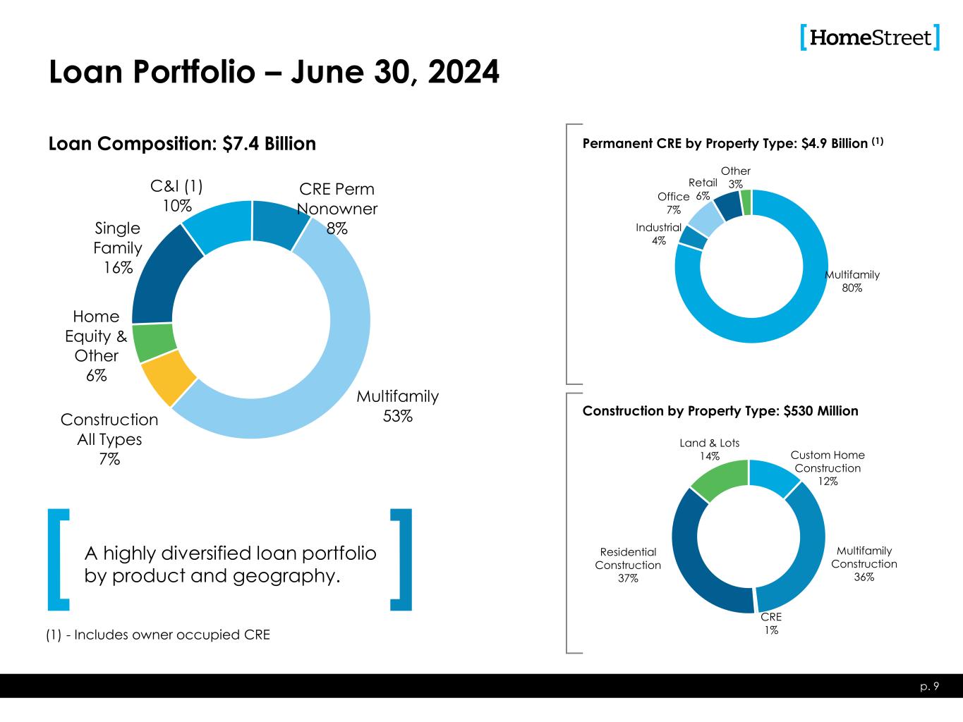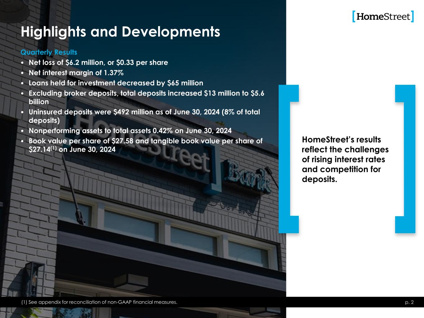 Highlights and Developments p. 2 Quarterly Results • Net loss of $6.2 million, or $0.33 per share • Net interest margin of 1.37% • Loans held for investment decreased by $65 million • Excluding broker deposits, total deposits increased $13 million to $5.6 billion • Uninsured deposits were $492 million as of June 30, 2024 (8% of total deposits) • Nonperforming assets to total assets 0.42% on June 30, 2024 • Book value per share of $27.58 and tangible book value per share of $27.14(1) on June 30, 2024 HomeStreet’s results reflect the challenges of rising interest rates and competition for deposits. (1) See appendix for reconciliation of non-GAAP financial measures.