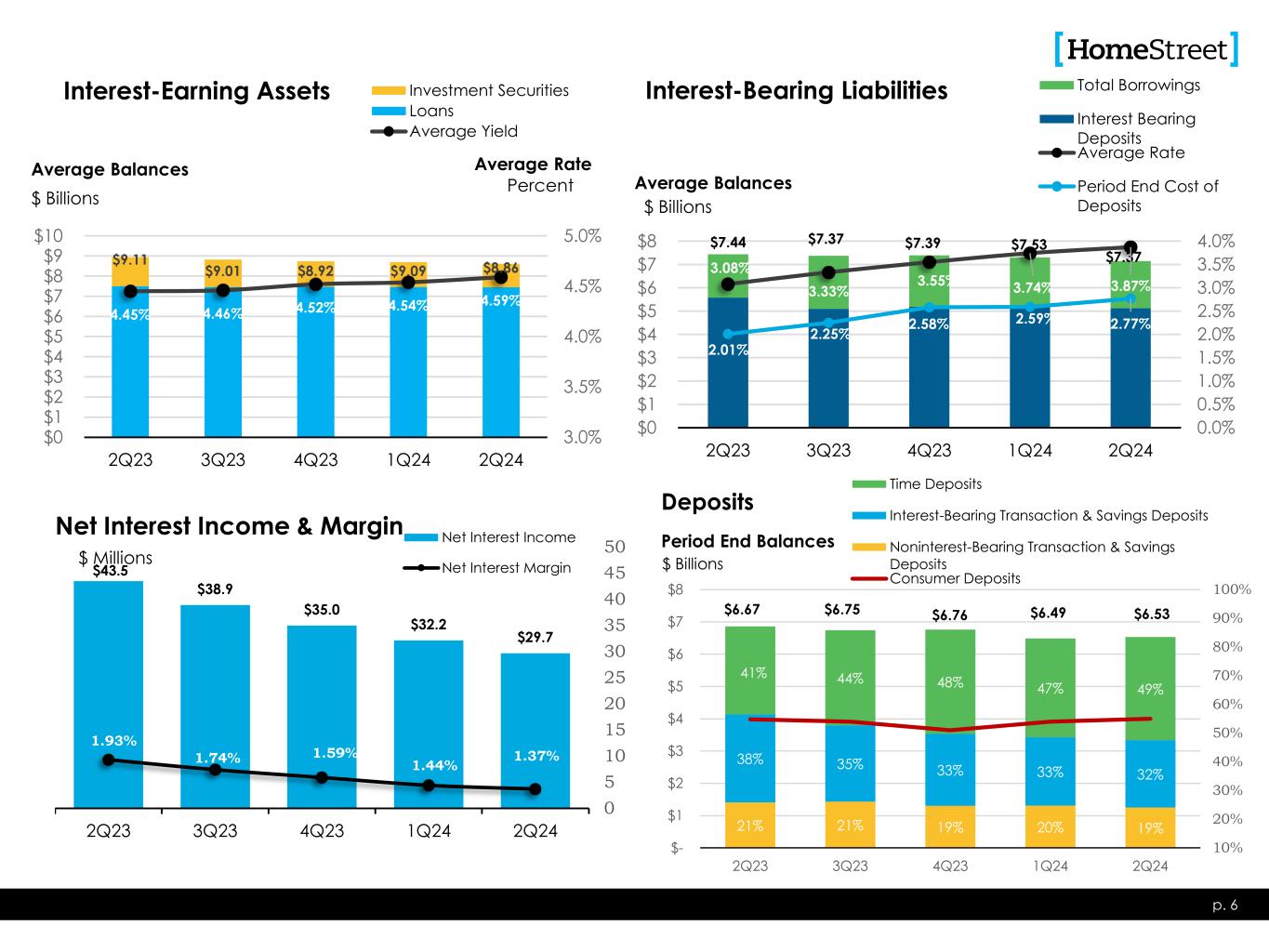 p. 5 Diversified Deposit Base: • The average balance of our noninterest-bearing consumer deposit accounts as of June 30, 2024, was $7,000 and overall average consumer deposit account balance was $29,000. • The average balance of our noninterest-bearing business deposit accounts as of June 30, 2024, was $64,000 and overall average business deposit account balance was $95,000. • As a percentage of our deposit portfolio, our top ten customers make up only 4.7% of our total deposit balances. • Uninsured deposits of $492 million as of June 30, 2024 (8% of total deposits) Continuing ability to attract new deposit clients • Our branch system added 130 new business customers in Q2 2024. • Commercial banking added 16 new customers in Q2 2024. Liquidity: • Our on-balance sheet liquidity as of June 30, 2024, was 15%. • Our available contingent liquidity borrowing sources ($4.9 billion) equal to 75% of the total amount of deposits outstanding as of June 30, 2024. • Optimizing funding costs by utilizing least cost option (borrowings / brokered deposits) Liquidity Considerations