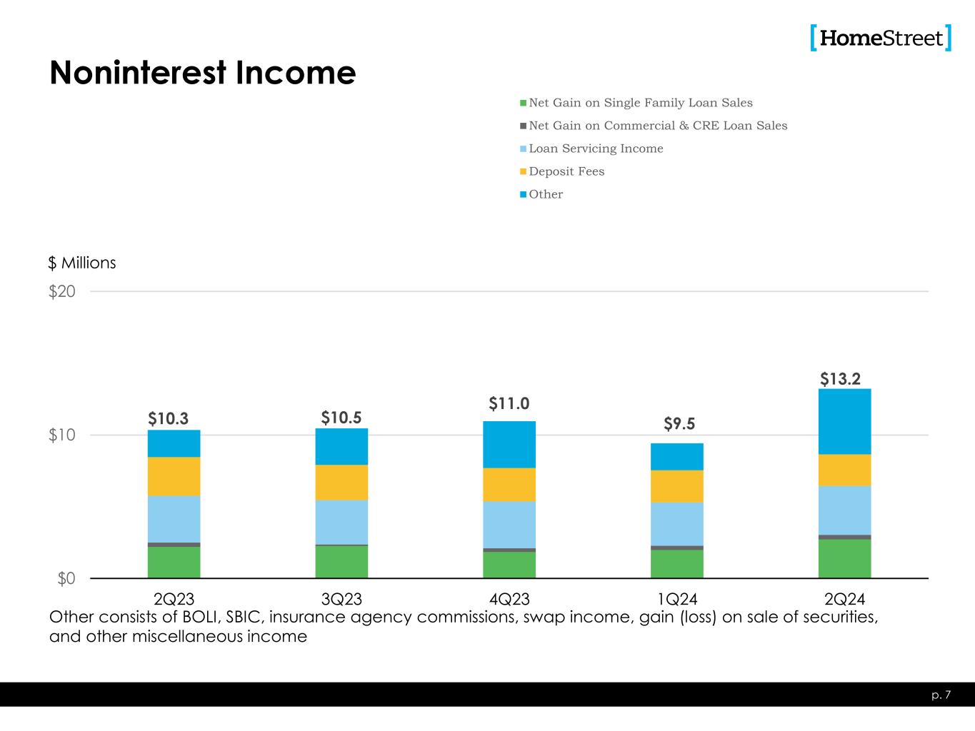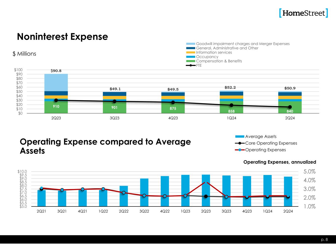 $10.3 $10.5 $11.0 $9.5 $13.2 $0 $10 $20 2Q23 3Q23 4Q23 1Q24 2Q24 Net Gain on Single Family Loan Sales Net Gain on Commercial & CRE Loan Sales Loan Servicing Income Deposit Fees Other Noninterest Income p. 7 $ Millions Other consists of BOLI, SBIC, insurance agency commissions, swap income, gain (loss) on sale of securities, and other miscellaneous income